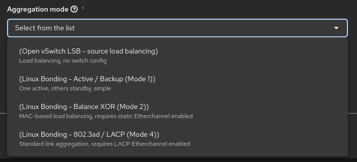 1. Go to Node network configuration 2. Click create 3. Get to page 3 4. Select bond option 5. Click aggregation dropdown