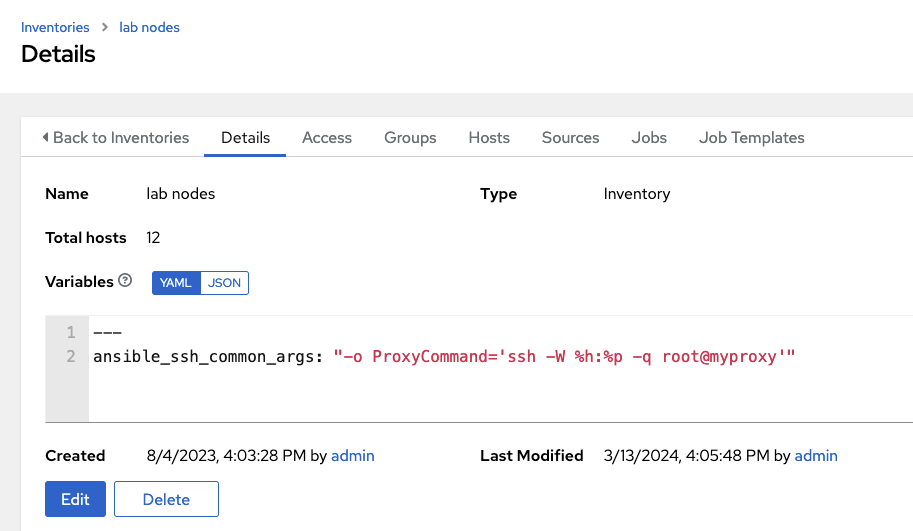 Inventory A: ansible_ssh_common_args: "-o ProxyCommand='ssh -W %h:%p -q root@proxyhost1'" Inventory B: ansible_ssh_common_args: "-o ProxyCommand='ssh -W %h:%p -q root@proxyhost2'" Constructed inventory: Inventory order 1.Inventory A, 2. Inventory B Host A present in only in inventory A. The ansible_ssh_common_args from Inventory B are used when connecting to the hosts