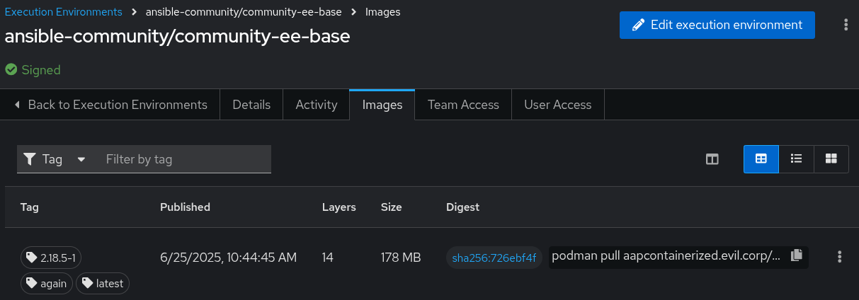Now, when the user adds a new tag to this image via the GUI the signature of that image/tag combination is removed. Despite this the Images view for an EE in PAH shows a Signed status (see screenshot where the 2.18.5-1 and latest tags are signed, but the again tag is not), which is incorrect and misleading.