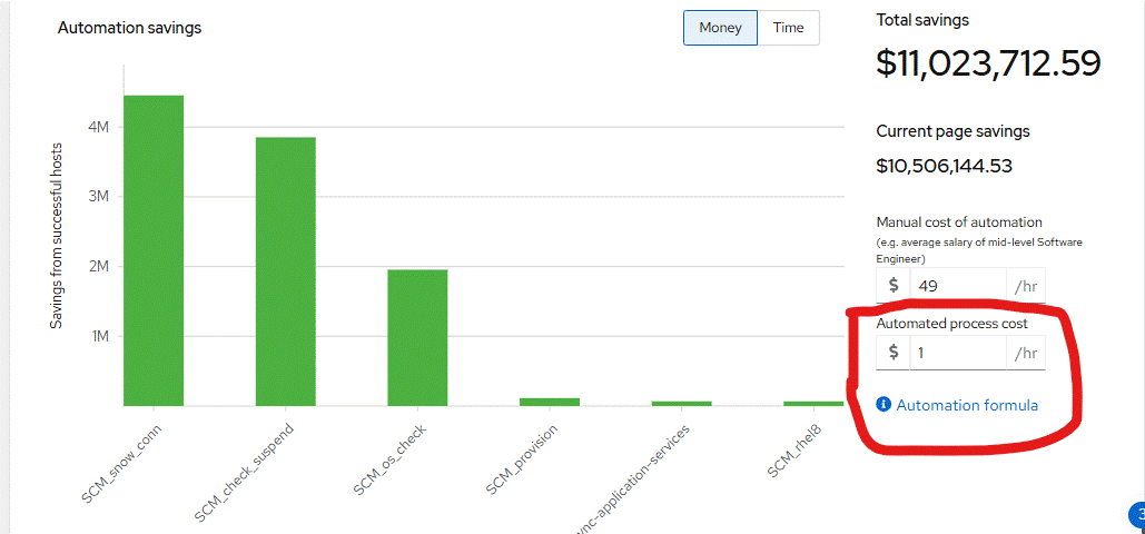 Automation Calculator in RedHat Insights console does not provide a detailed clue to update the automation cost. Refer attached screenshot. I am able to login to RedHat Insights portal to define the automation savings cost for all the Job Templates running in Ansible automation platform in my customer environment. When I do so, I need to update a field called as "Automated process cost" which is based on hourly basis. In reality, I had discussed with your RedHat Principal Architect Steve Arnold who also agree with me that this field calculation cannot be done on hourly basis as the development cost will be going to be one time and not hourly basis.