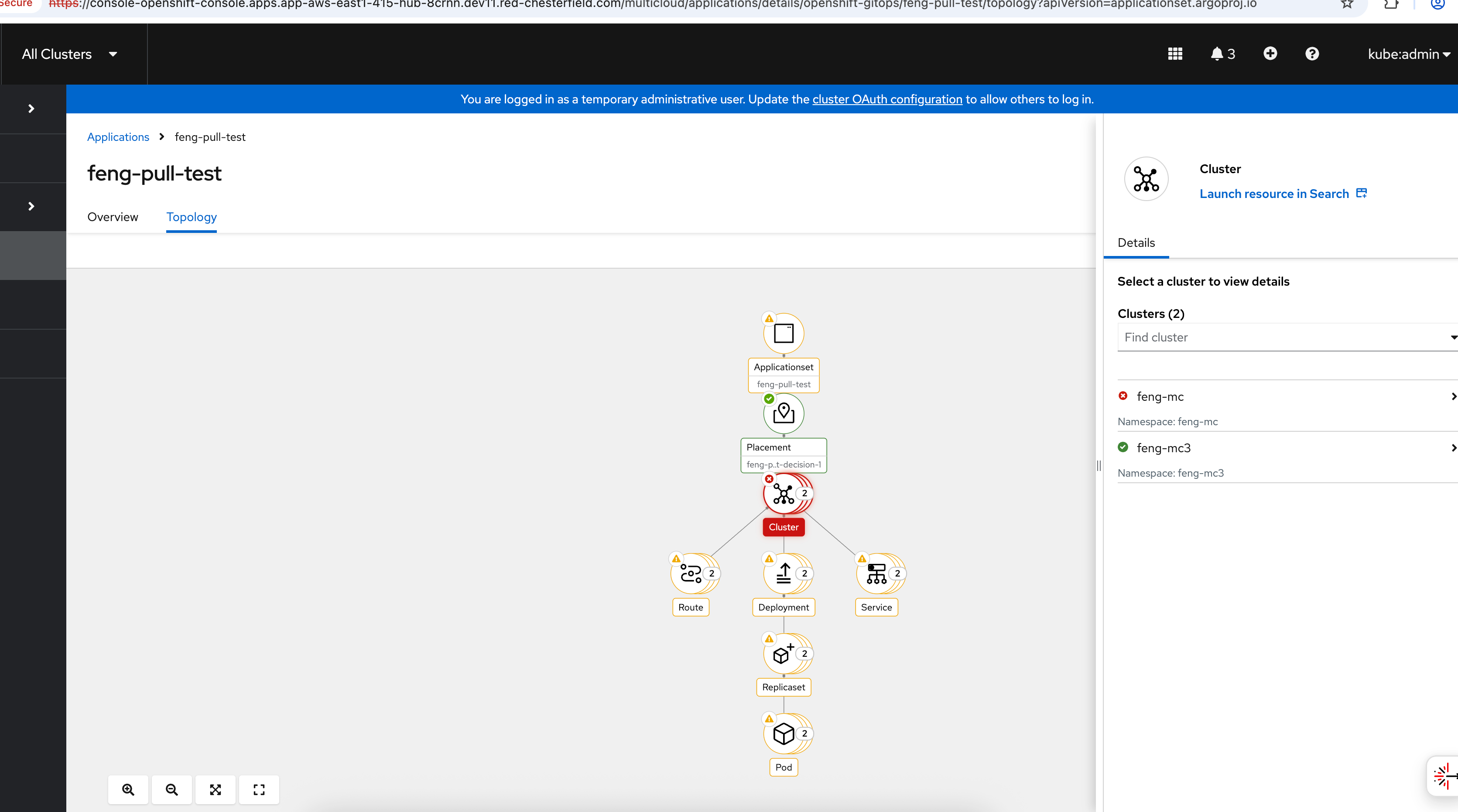 The application was initially deployed to feng-mc2 which I then hibernated and caused the application to be deployed to feng-mc1. In the PlacementDecision we can see that feng-mc1 is now selected but the UI is still displaying both clusters because the MulticlusterApplicationSetReport still shows both clusters.