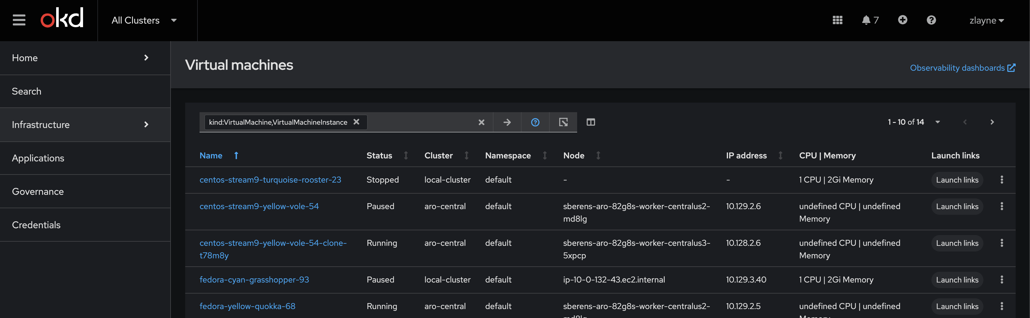- Select/checkbox filter on: Status, Template, OS, Live migratable, Node, and Instance type
