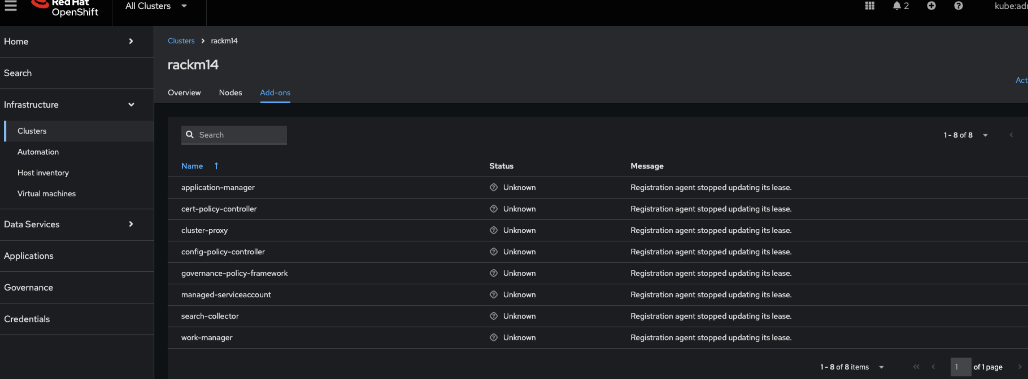 Successfully imported cluster to ACM managed hub are moving to 'Unknown' status frequently. Addons are moving to 'Unknown' status and the message shown is, 'Registration agent stopped updating its lease.' In approx 15 mins the cluster is moving to 'Unknown' status