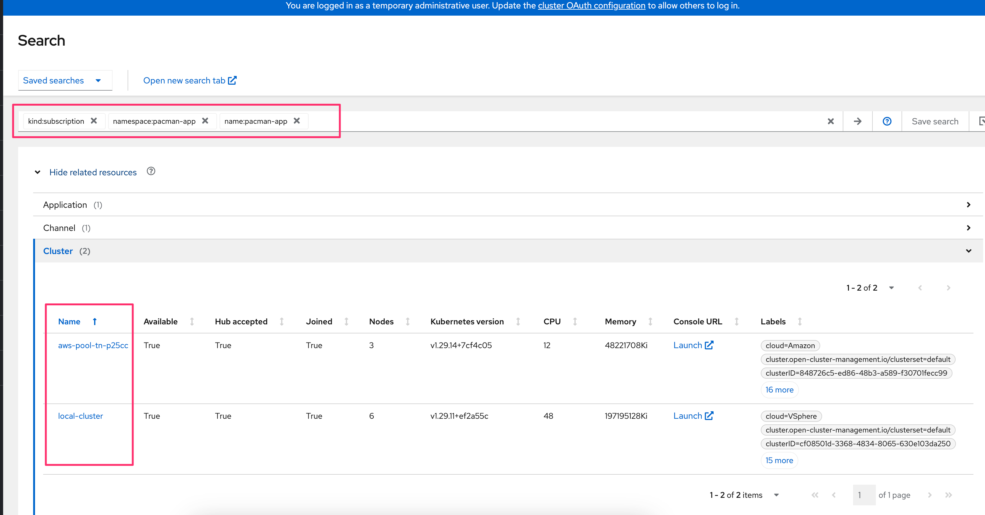 - Notice one of the managed cluster will be missing from the related results