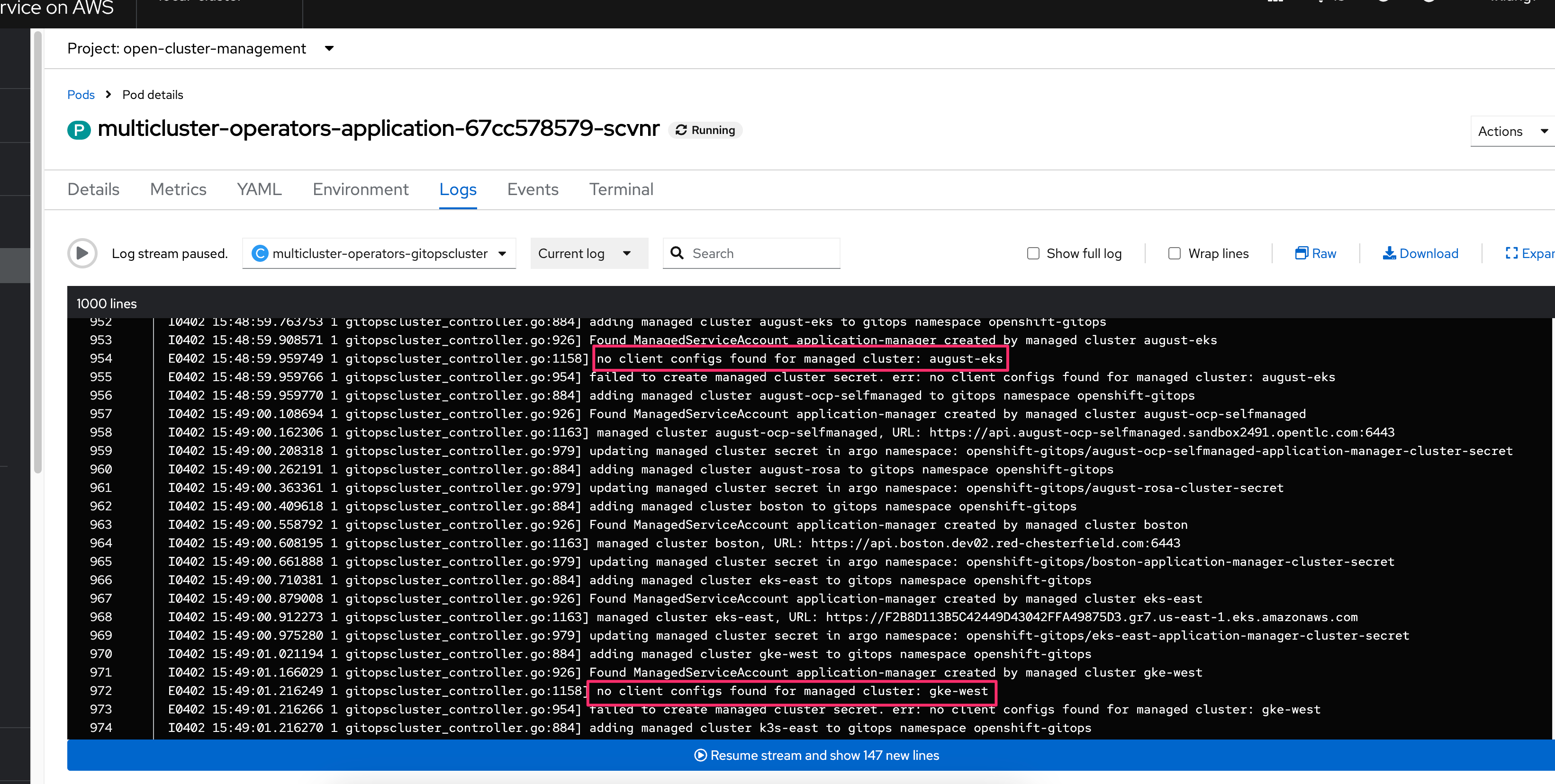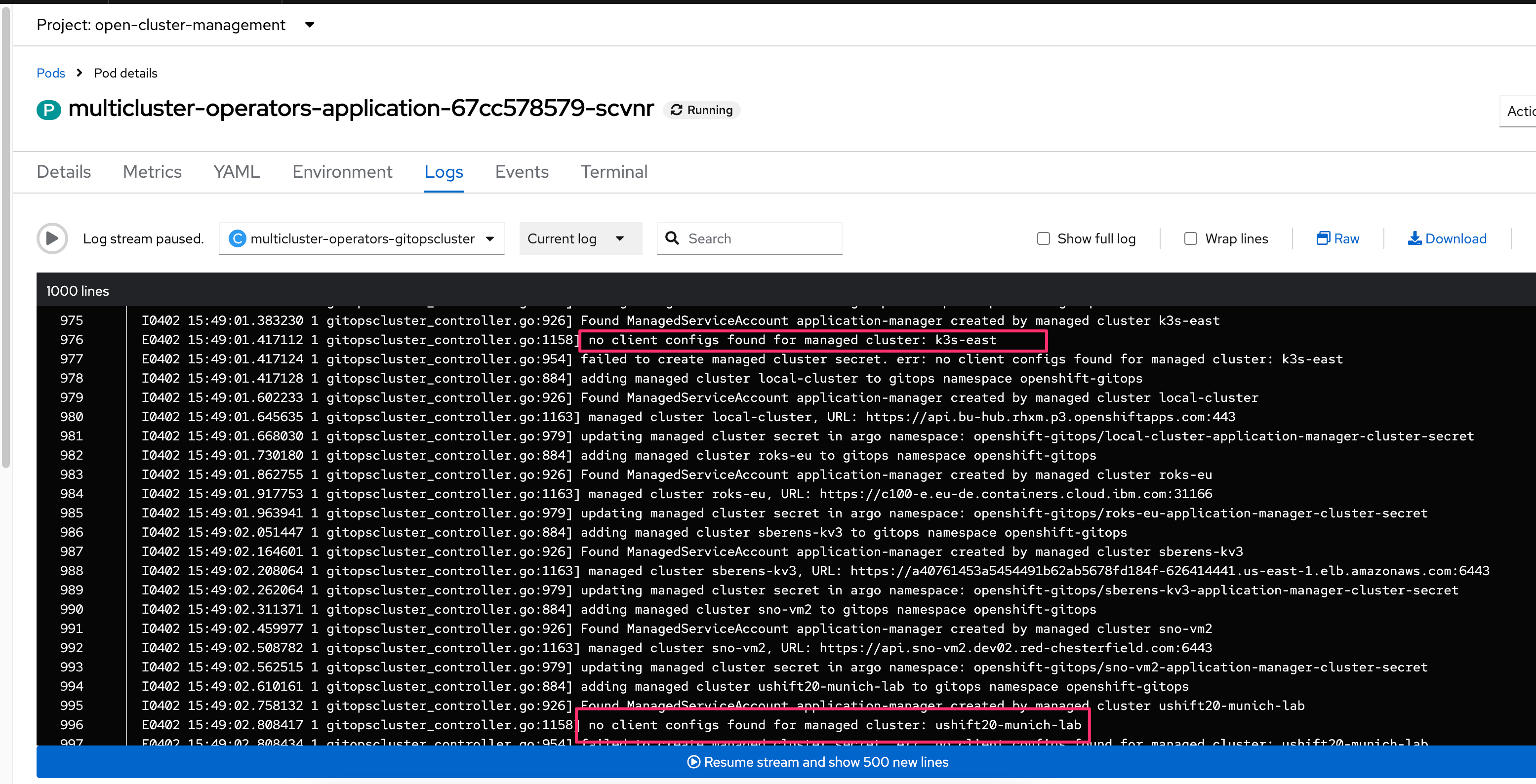 kind: GitOpsCluster metadata: creationTimestamp: '2025-03-12T06:08:12Z' generation: 1 managedFields: - apiVersion: apps.open-cluster-management.io/v1beta1 fieldsType: FieldsV1 fieldsV1: f:spec: .: {} f:argoServer: .: {} f:argoNamespace: {} f:placementRef: {} manager: unknown operation: Update time: '2025-03-12T06:08:12Z' - apiVersion: apps.open-cluster-management.io/v1beta1 fieldsType: FieldsV1 fieldsV1: f:status: .: {} f:lastUpdateTime: {} f:message: {} f:phase: {} manager: gitopscluster operation: Update subresource: status time: '2025-04-02T15:35:26Z' name: august-argo namespace: openshift-gitops resourceVersion: '187501959' uid: a2d10da2-1ce4-4dd2-a3c5-d68560c38a1d spec: argoServer: argoNamespace: openshift-gitops placementRef: apiVersion: cluster.open-cluster-management.io/v1beta1 kind: Placement name: august-argo-placement status: lastUpdateTime: '2025-04-02T15:35:26Z' message: 'no client configs found for managed cluster: ushift20-munich-lab' phase: failed