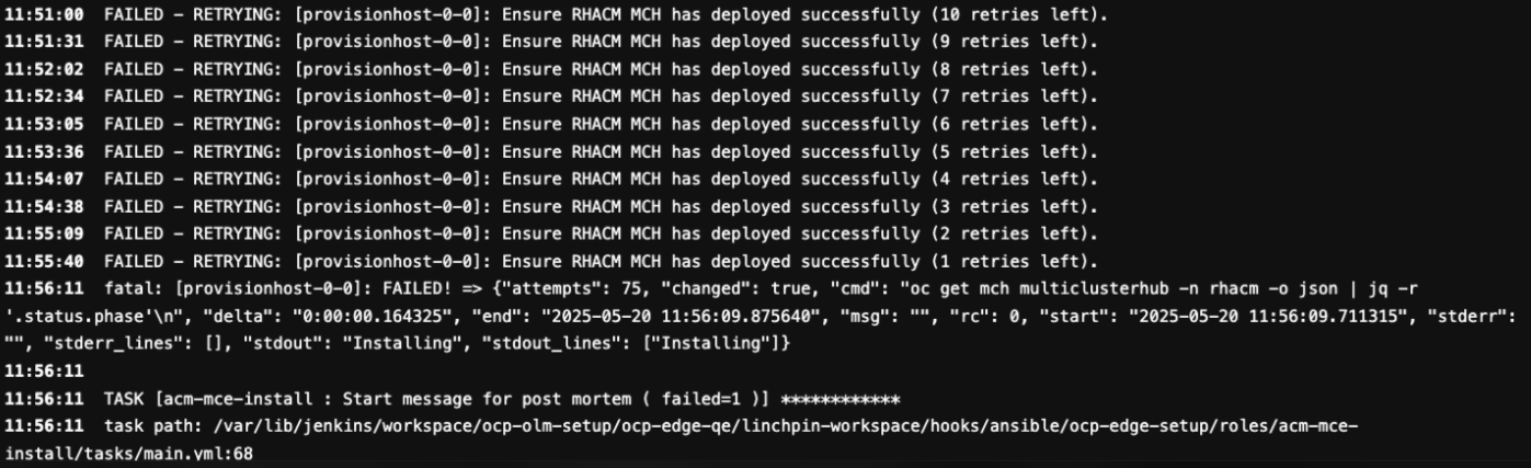 RHACM 2.13 deployment failed using ocp-olm-setup job with the following error: