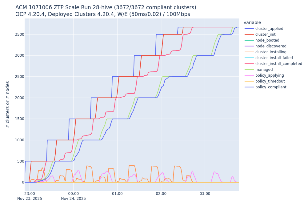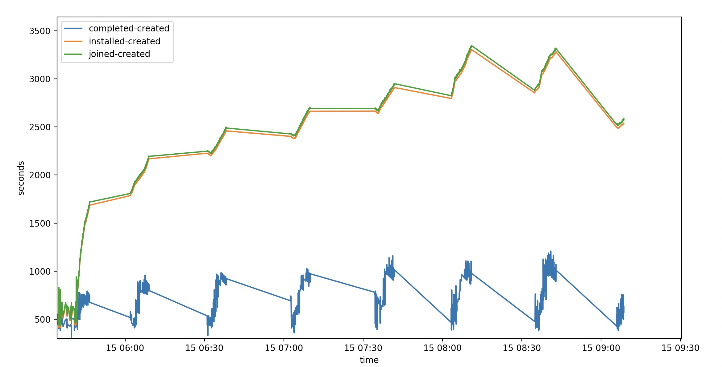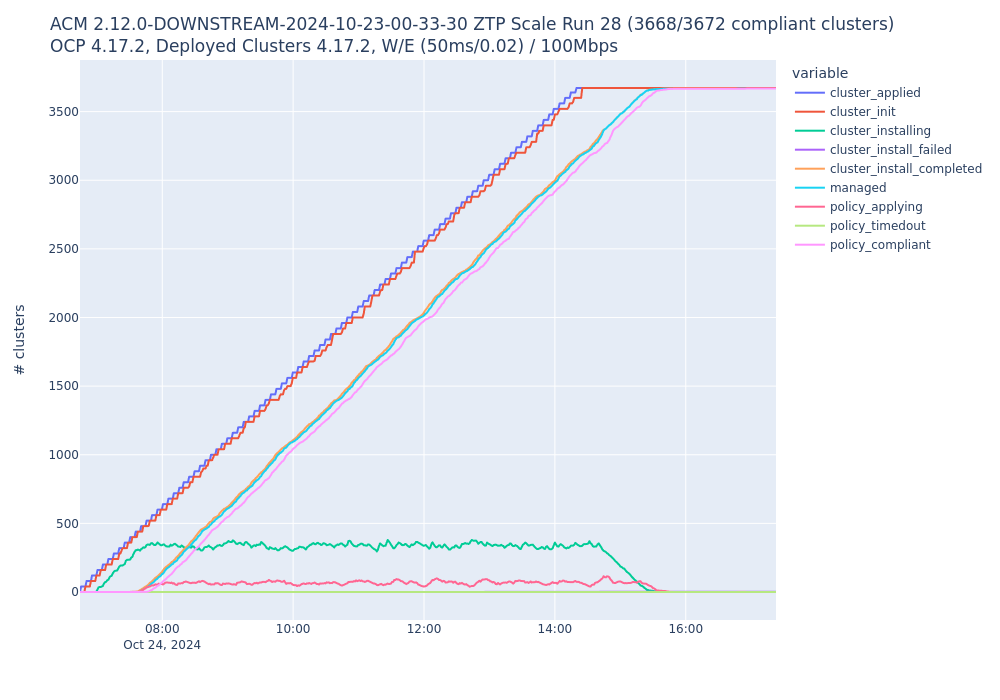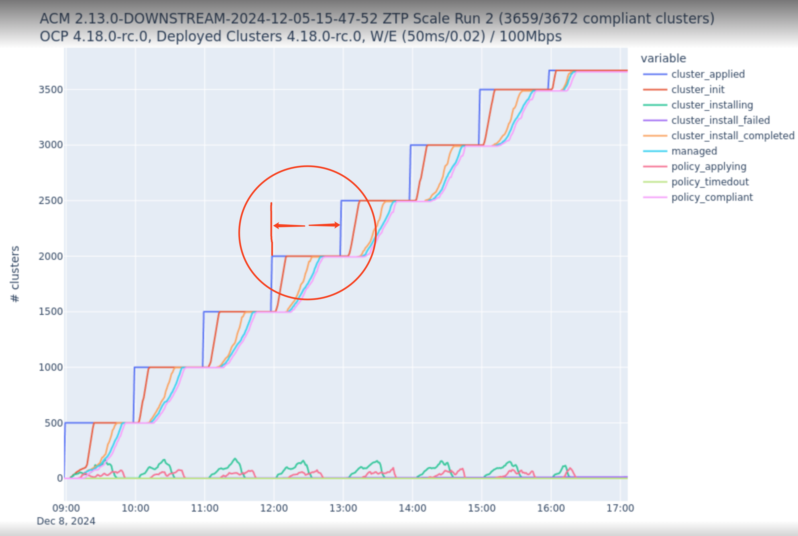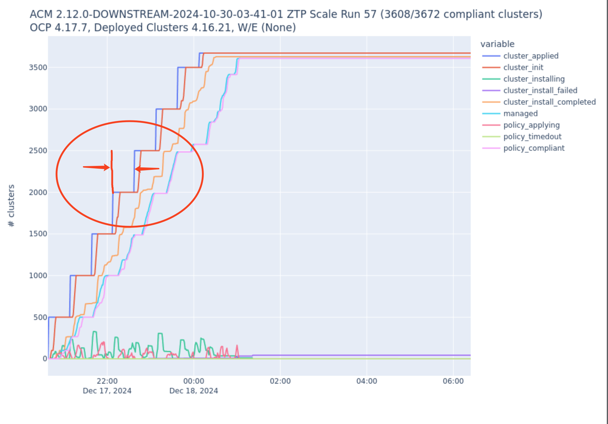 While installing 3672 SNOs via Image based install operator there is a very noticeable delay in the time post a cluster is installed and when the cluster becomes managed as shown in the results graph. (Review graph with annotations showing delays) The delays appear to have began when 2384 clusters were managed, lasted about 20 minutes before clusters started becoming managed again. The next delay was about 30 minutes and you can see further delays. This behavior is much different than agent based cluster installs in which no large 20 or 30 minute plus delays prevent any newly installed clusters from becoming managed.Â
