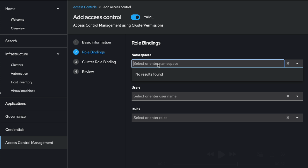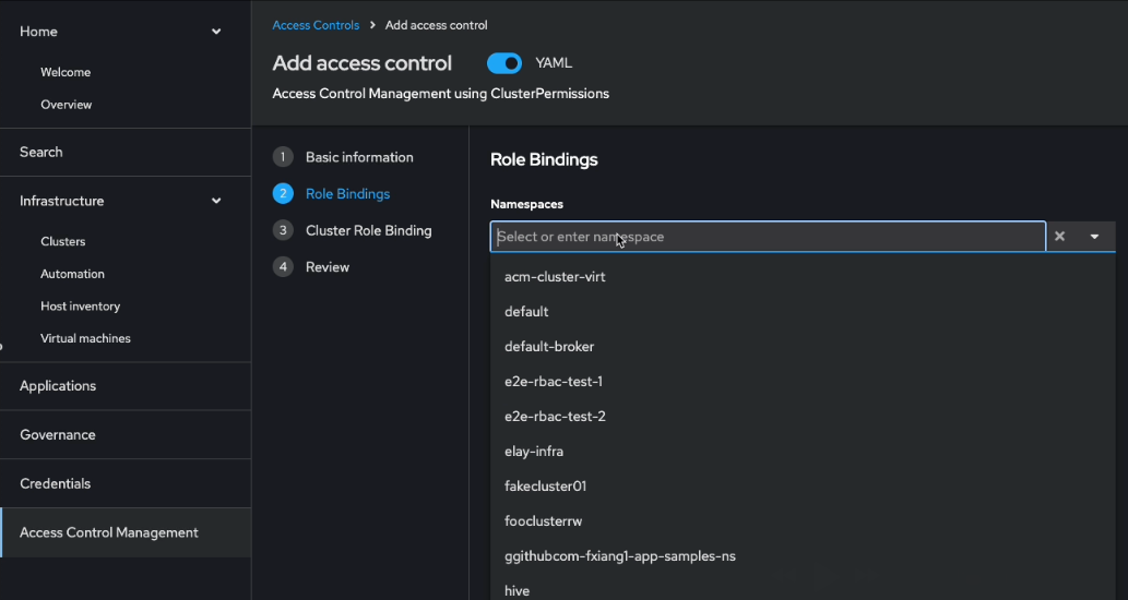 For create access control, the namespace drop down (search) is only showing namespaces for local-cluster and not managed clusters.