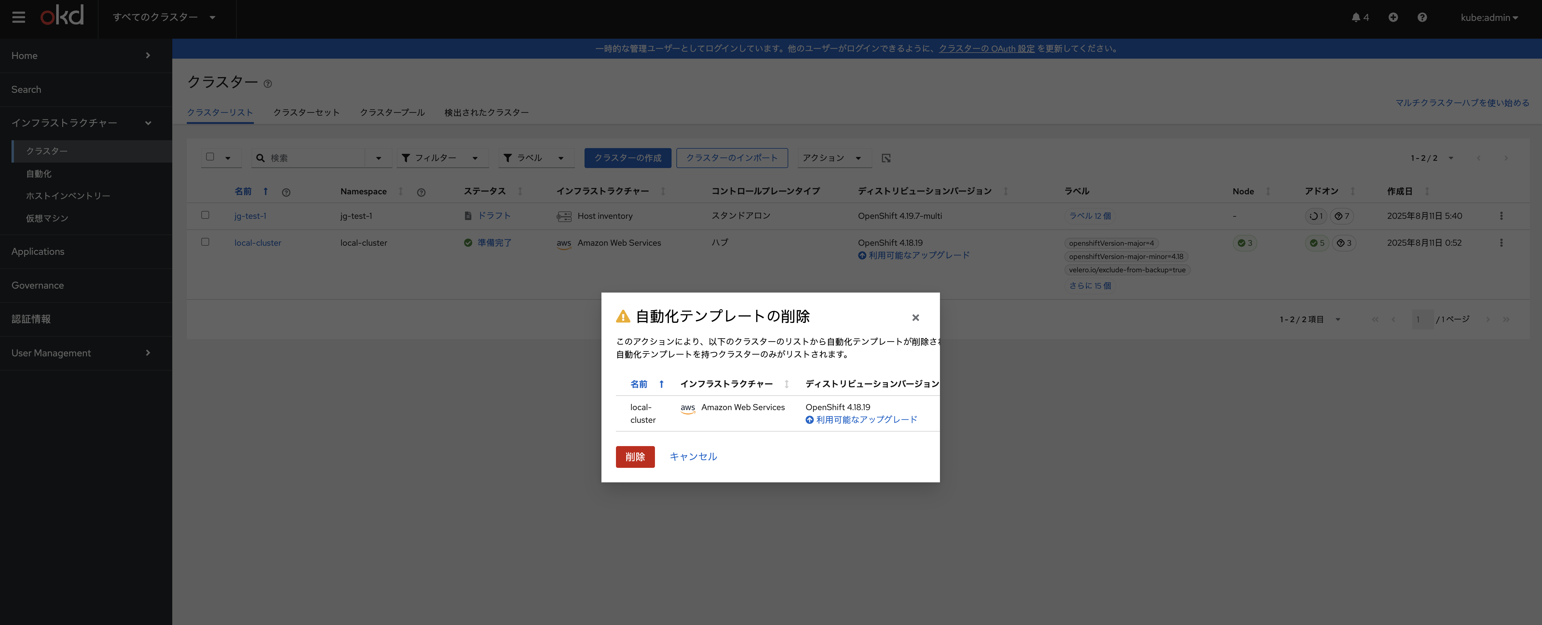 - Navigate to Infrastructure - Clusters - Actions - Remove automation templates