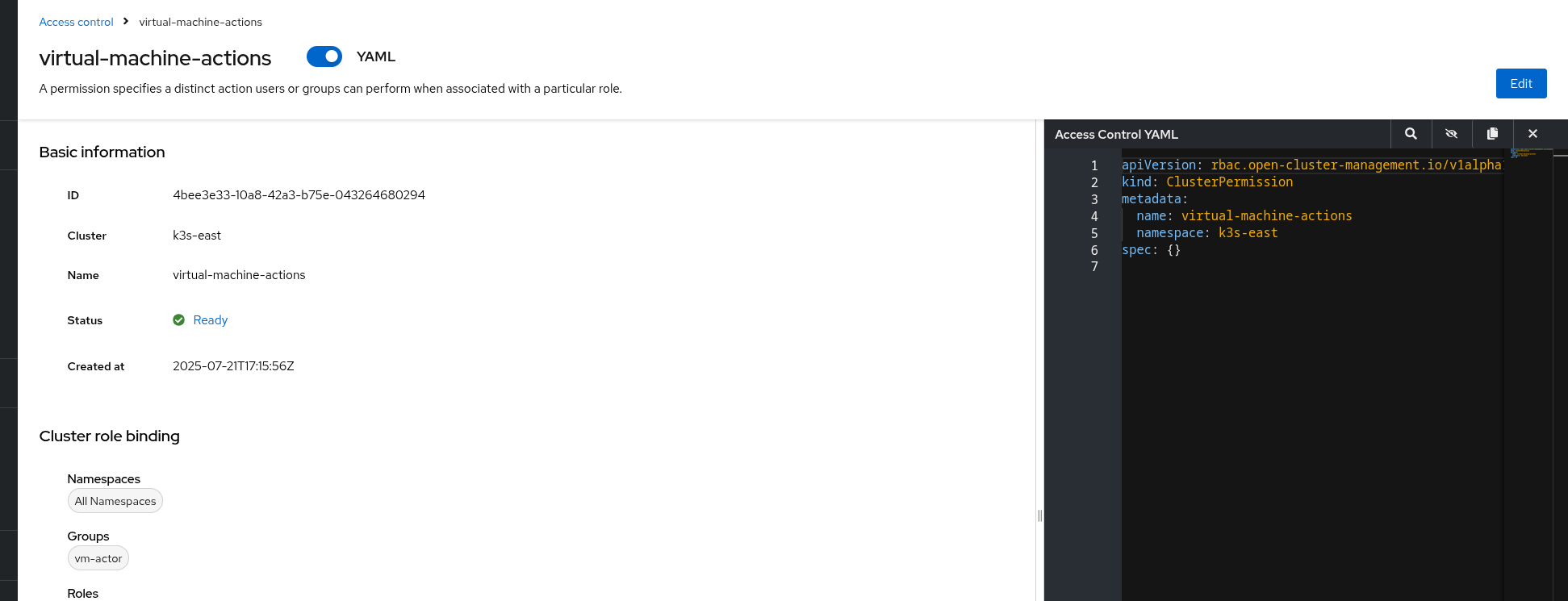 apiVersion: rbac.open-cluster-management.io/v1alpha1 kind: ClusterPermission metadata: creationTimestamp: '2025-07-21T17:15:56Z' generation: 1 name: virtual-machine-actions resourceVersion: '694038430' uid: d4f7f4a4-1474-4f2a-9002-4bfcbaca3331 labels: app: search feature: virtual-machine namespace: aks-central spec: clusterRole: rules: - resources: - virtualmachines/start - virtualmachines/stop - virtualmachines/restart - virtualmachineinstances/pause - virtualmachineinstances/unpause apiGroups: - subresources.kubevirt.io verbs: - update clusterRoleBinding: subject: kind: ServiceAccount name: vm-actor namespace: open-cluster-management-agent-addon status: conditions: - status: 'True' lastTransitionTime: '2025-07-21T17:15:56Z' message: >- Run the following command to check the ManifestWork status: kubectl -n aks-central get ManifestWork virtual-machine-actions-d4f7f -o yaml reason: AppliedRBACManifestWork type: AppliedRBACManifestWork