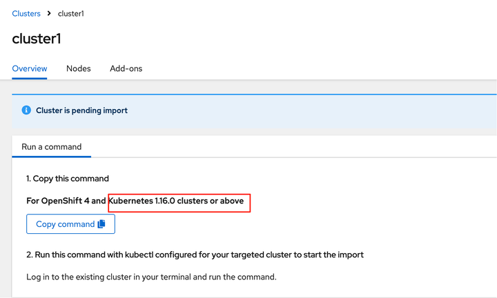 When customer imports a cluster in RHACM they are given the option to copy and run a command. This action is prefaced with the warning"For OpenShift 4 and Kubernetes 1.16.0 clusters or above." (see attached image)