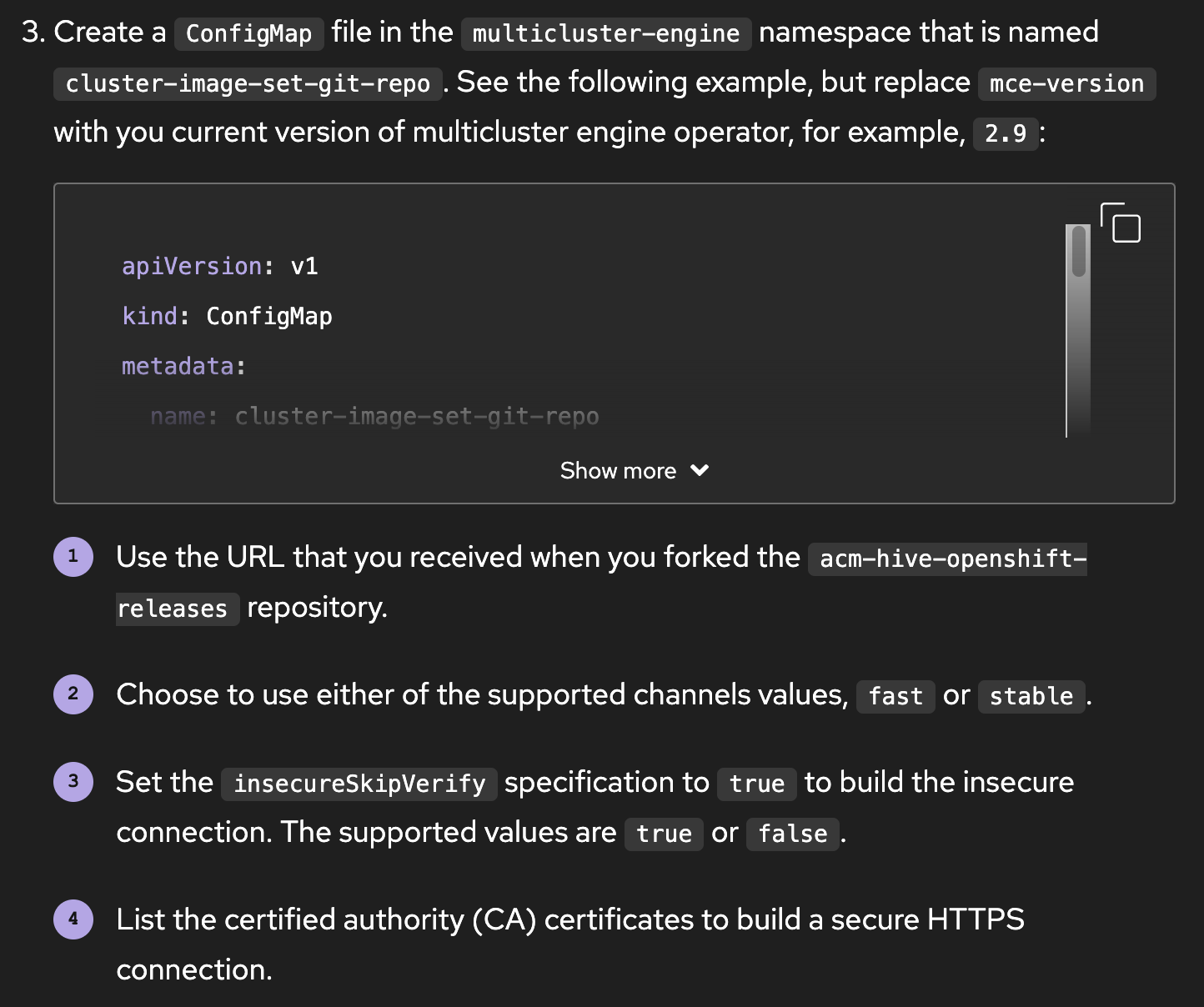 - https://content-stage.docs.redhat.com/en/documentation/red_hat_advanced_cluster_management_for_kubernetes/2.14/html/clusters/cluster_mce_overview#release-images-disconnected