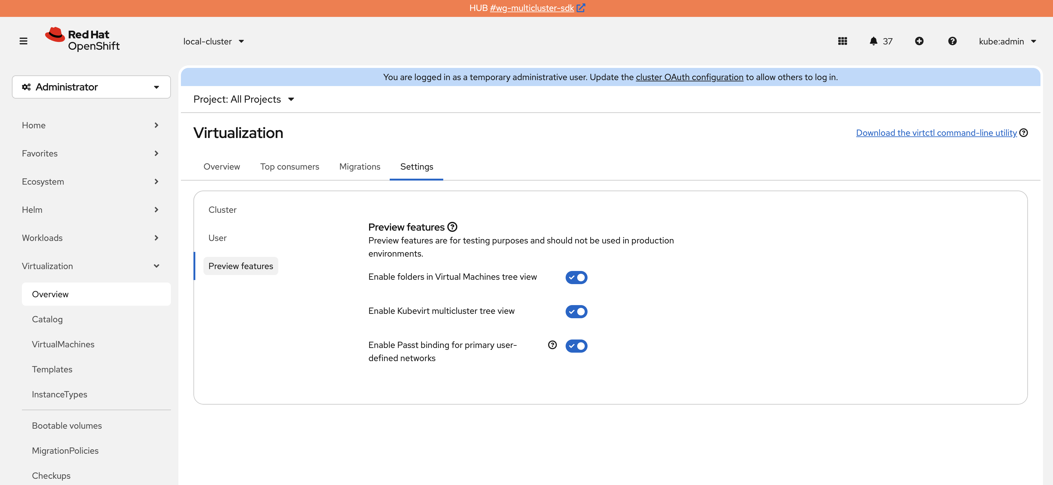 - A user can enable or disable the CNV/MTV integration feature from the console