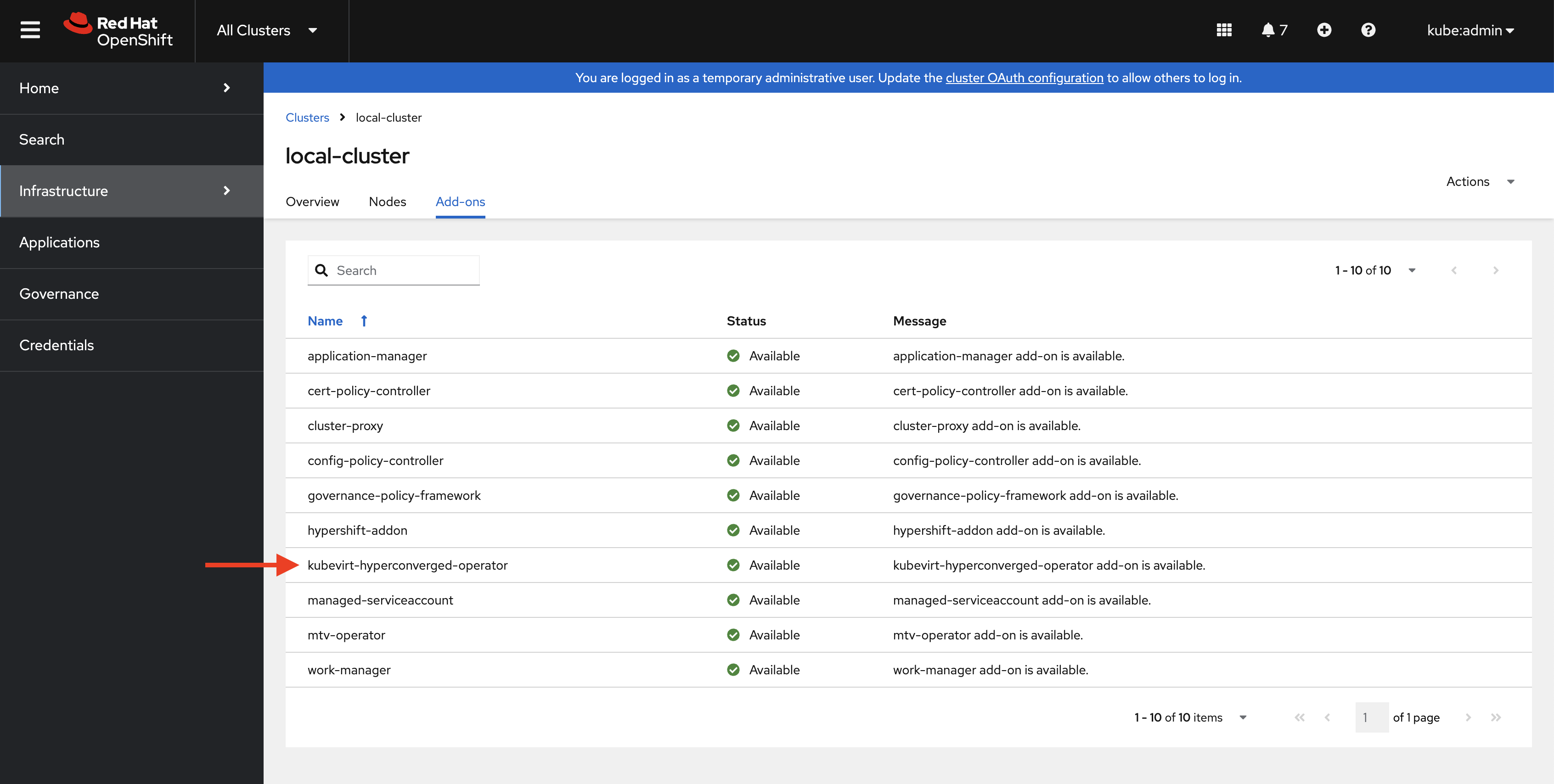 - When the integration is enabled, the user can enable/disable automatic installation of CNV onto specific managed clusters via a cluster action.