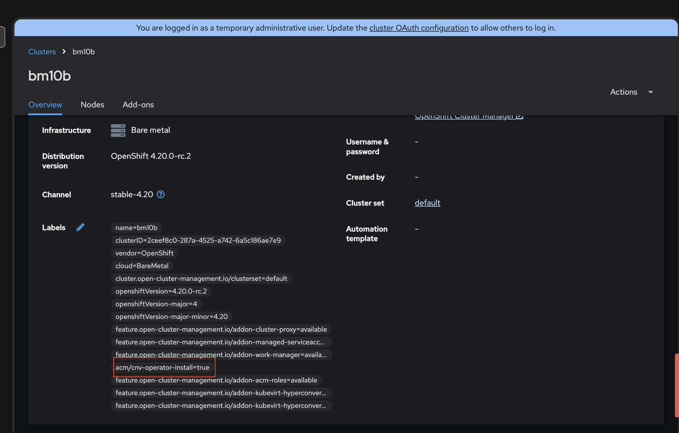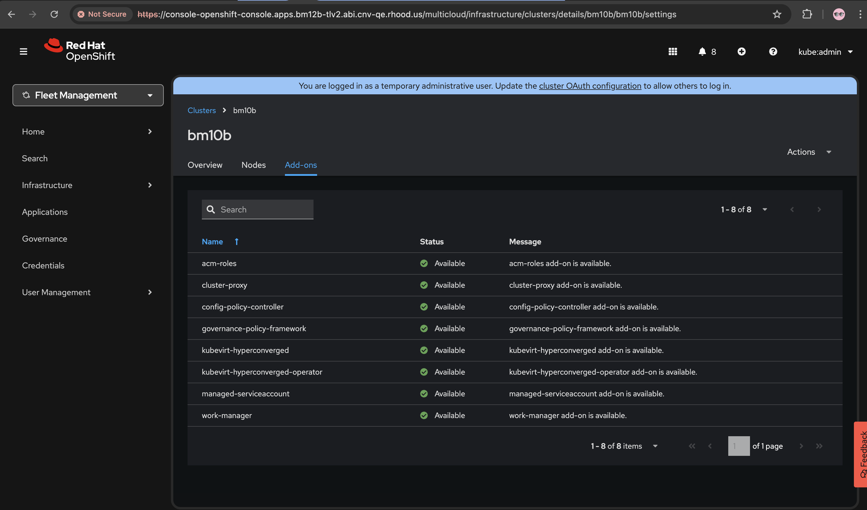- Without the managed add-on, the hub never delivers the governance policy framework CRDs to the spoke. Downstream features (for example, labeling the spoke with cluster.open-cluster-management.io/cnv=true so CNV deploys) do not activate because their dependency on the policy framework never materializes.