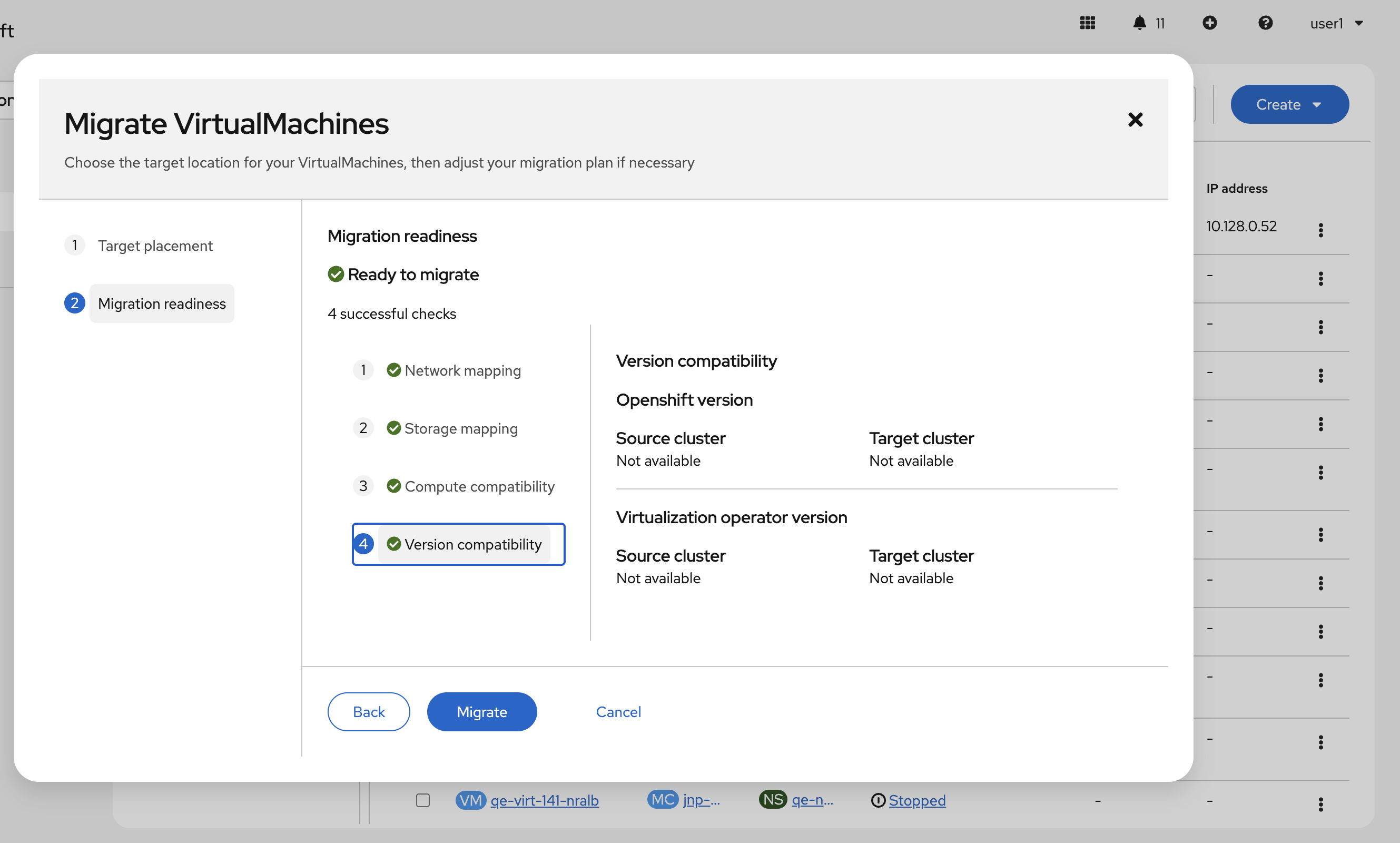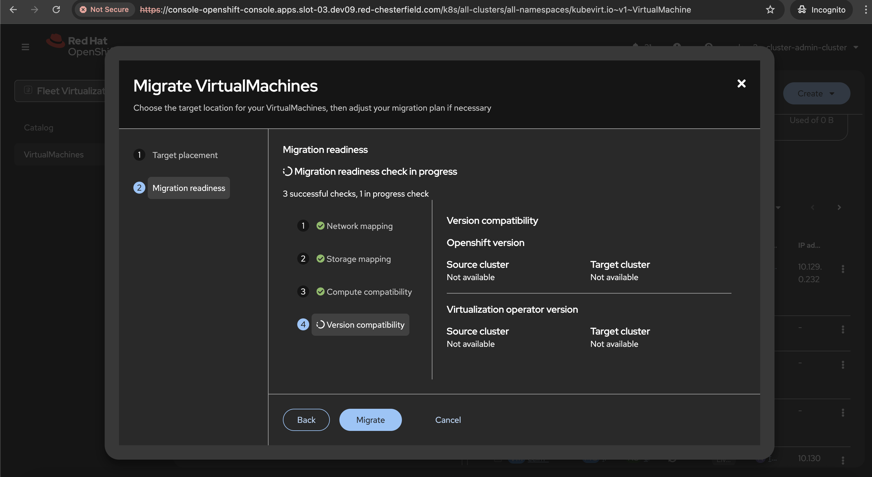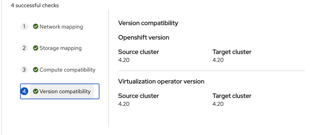 Note that migration can be triggered and succeeds. When logged in as kubeadmin, version check passes.