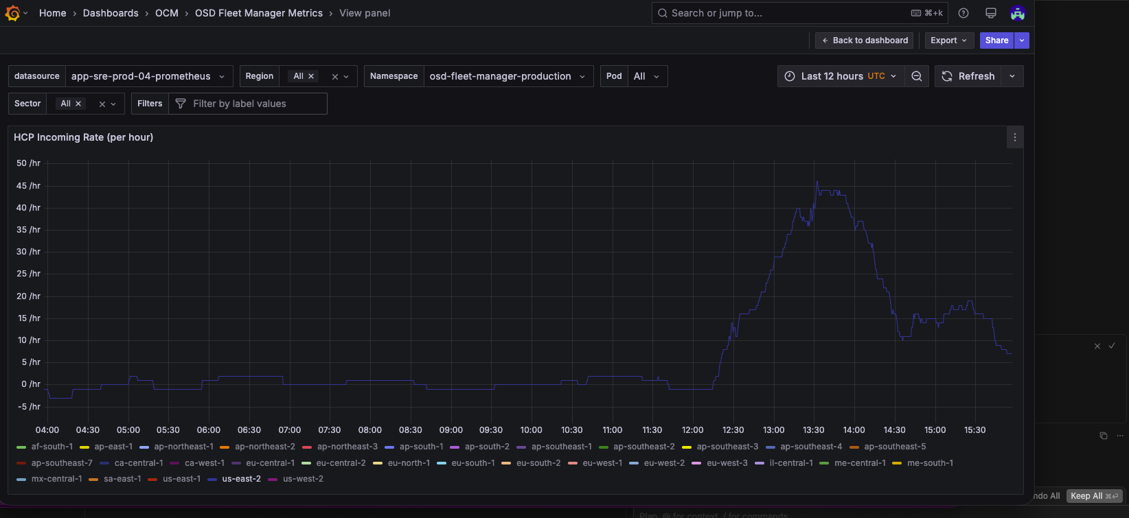 Starting at Nov 18 7:13 AM EST, the HCP incoming rate in the us-east-2 region began a steep and sustained increase, peaking at a critical load of 46 HCP per hour. See deatil in grafana dashboard