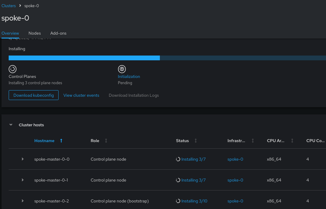 apiVersion: hive.openshift.io/v1 kind: ClusterDeployment metadata: name: censored-int-01 namespace: censored-int-01 labels: cluster.open-cluster-management.io/clusterset: default hive.openshift.io/cluster-platform: agent-baremetal spec: clusterName: censored-int-01 platform: agentBareMetal: agentSelector: {} baseDomain: cloud.example.com controlPlaneConfig: servingCertificates: {} installed: false pullSecretRef: name: censored-int-01-pull-secret clusterInstallRef: kind: AgentClusterInstall name: censored-int-01 group: extensions.hive.openshift.io version: v1beta1 preserveOnDelete: false --- apiVersion: extensions.hive.openshift.io/v1beta1 kind: AgentClusterInstall metadata: name: censored-int-01 namespace: censored-int-01 spec: clusterDeploymentRef: name: censored-int-01 apiVIP: 192.168.0.8 imageSetRef: name: openshift-v4.18.22-x86-64 ingressVIP: 192.168.0.9 networking: networkType: OVNKubernetes clusterNetwork: - cidr: 10.140.0.0/18 hostPrefix: 23 serviceNetwork: - 1.2.3.4/18 userManagedNetworking: false machineNetwork: - cidr: 5.6.7.8/24 provisionRequirements: controlPlaneAgents: 3 sshPublicKey: >- ssh-ed25519 CENSORED holdInstallation: true manifestsConfigMapRef: name: additional-installation-manifests --- kind: Secret apiVersion: v1 metadata: name: censored-int-01-pull-secret namespace: censored-int-01 labels: agent-install.openshift.io/watch: 'true' cluster.open-cluster-management.io/backup: 'true' data: .dockerconfigjson: >- CENSORED type: kubernetes.io/dockerconfigjson --- apiVersion: cluster.open-cluster-management.io/v1 kind: ManagedCluster metadata: name: censored-int-01 labels: cloud: BareMetal cluster.open-cluster-management.io/clusterset: default feature.open-cluster-management.io/addon-application-manager: unreachable feature.open-cluster-management.io/addon-cert-policy-controller: unreachable feature.open-cluster-management.io/addon-cluster-proxy: unreachable feature.open-cluster-management.io/addon-config-policy-controller: unreachable feature.open-cluster-management.io/addon-governance-policy-framework: unreachable feature.open-cluster-management.io/addon-observability-controller: unreachable feature.open-cluster-management.io/addon-search-collector: unreachable feature.open-cluster-management.io/addon-work-manager: unreachable name: censored-int-01 vendor: OpenShift spec: hubAcceptsClient: true leaseDurationSeconds: 60 taints: - effect: NoSelect key: cluster.open-cluster-management.io/unreachable timeAdded: '2025-12-08T11:47:00Z' --- apiVersion: agent.open-cluster-management.io/v1 kind: KlusterletAddonConfig metadata: name: censored-int-01 namespace: censored-int-01 spec: applicationManager: enabled: true certPolicyController: enabled: true clusterLabels: cloud: Baremetal vendor: OpenShift clusterName: censored-int-01 clusterNamespace: censored-int-01 iamPolicyController: enabled: true policyController: enabled: true searchCollector: enabled: true
