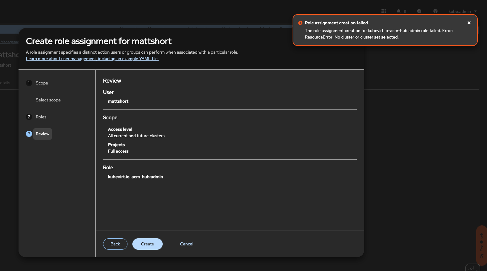 In a cluster with 0 existing MulticlusterRoleAssignments and role assignment Placements, I get this error when trying to create a global access role assignment: