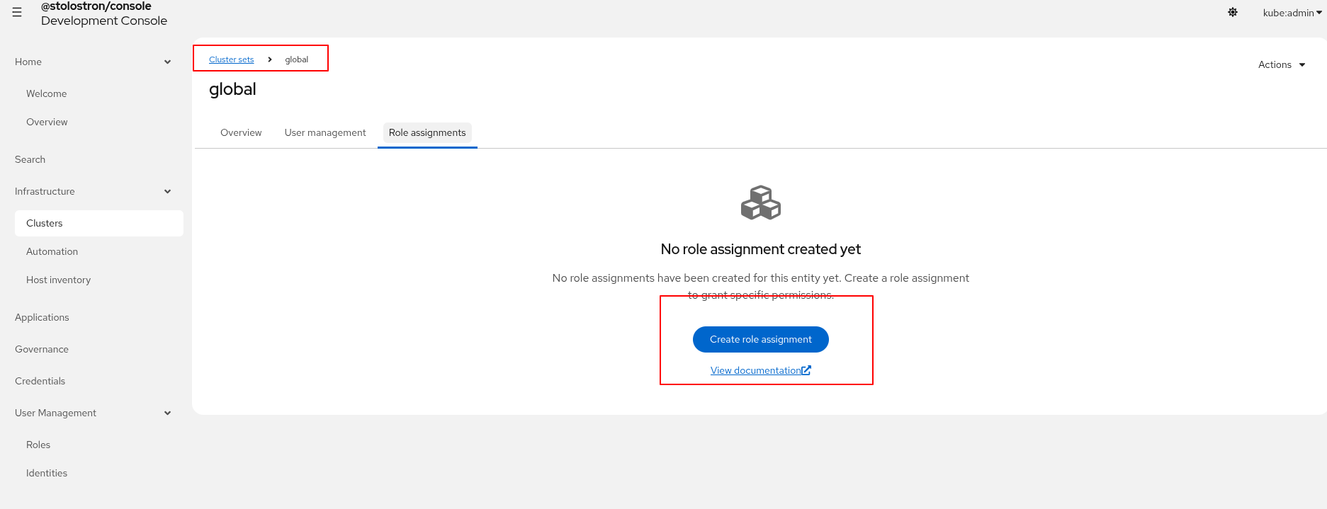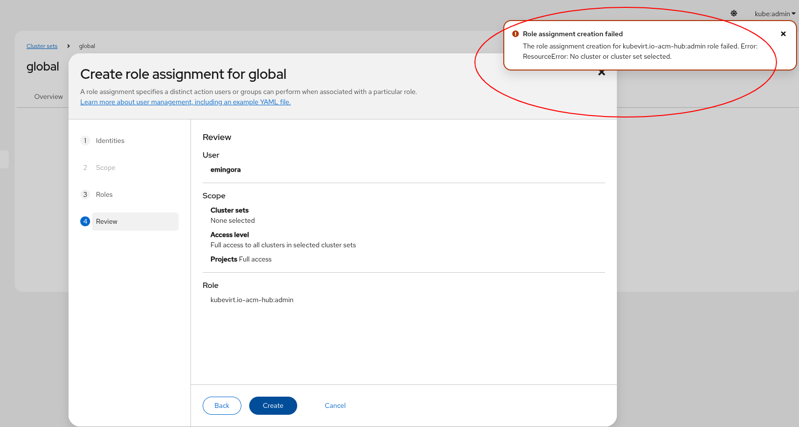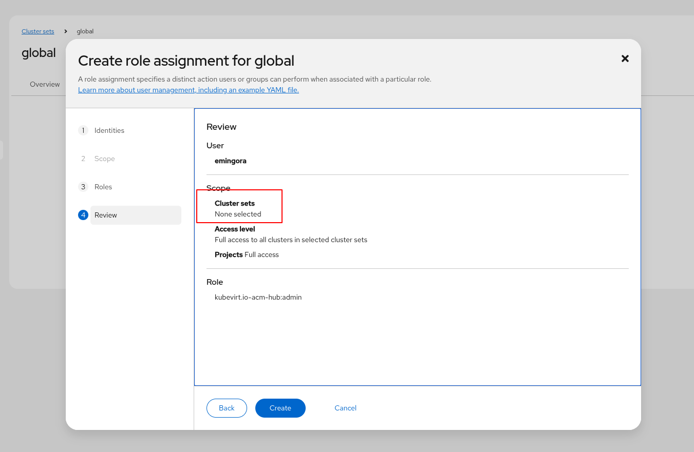 it is not possible from business perspective, to create a role assignment for a global cluster set but it is actually possible to do it by navigating to clusters -> cluster sets -> global -> role assignments -> create role assignment. Once submitted an error is thrown saying there's no cluster selection.