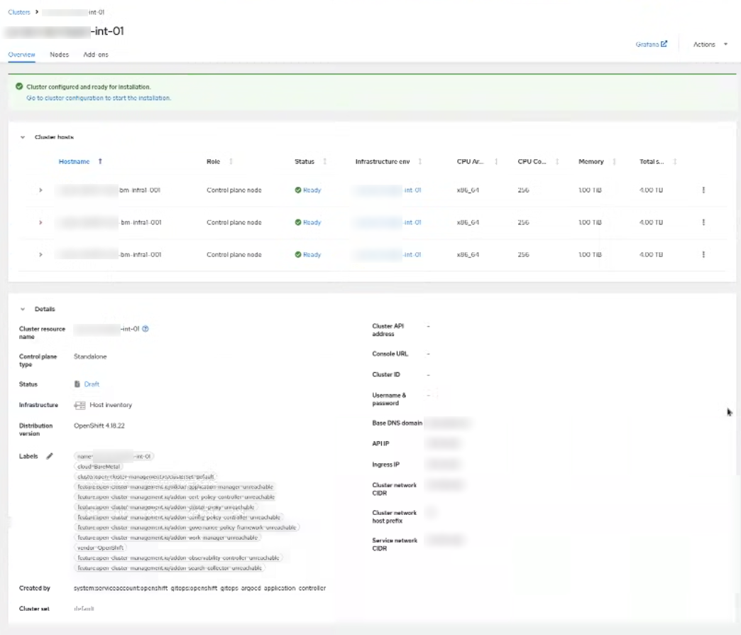 apiVersion: hive.openshift.io/v1 kind: ClusterDeployment metadata: name: censored-int-01 namespace: censored-int-01 labels: cluster.open-cluster-management.io/clusterset: default hive.openshift.io/cluster-platform: agent-baremetal spec: clusterName: censored-int-01 platform: agentBareMetal: agentSelector: {} baseDomain: cloud.example.com controlPlaneConfig: servingCertificates: {} installed: false pullSecretRef: name: censored-int-01-pull-secret clusterInstallRef: kind: AgentClusterInstall name: censored-int-01 group: extensions.hive.openshift.io version: v1beta1 preserveOnDelete: false --- apiVersion: extensions.hive.openshift.io/v1beta1 kind: AgentClusterInstall metadata: name: censored-int-01 namespace: censored-int-01 spec: clusterDeploymentRef: name: censored-int-01 apiVIP: 192.168.0.8 imageSetRef: name: openshift-v4.18.22-x86-64 ingressVIP: 192.168.0.9 networking: networkType: OVNKubernetes clusterNetwork: - cidr: 10.140.0.0/18 hostPrefix: 23 serviceNetwork: - 1.2.3.4/18 userManagedNetworking: false machineNetwork: - cidr: 5.6.7.8/24 provisionRequirements: controlPlaneAgents: 3 sshPublicKey: >- ssh-ed25519 CENSORED holdInstallation: true manifestsConfigMapRef: name: additional-installation-manifests --- kind: Secret apiVersion: v1 metadata: name: censored-int-01-pull-secret namespace: censored-int-01 labels: agent-install.openshift.io/watch: 'true' cluster.open-cluster-management.io/backup: 'true' data: .dockerconfigjson: >- CENSORED type: kubernetes.io/dockerconfigjson --- apiVersion: cluster.open-cluster-management.io/v1 kind: ManagedCluster metadata: name: censored-int-01 labels: cloud: BareMetal cluster.open-cluster-management.io/clusterset: default feature.open-cluster-management.io/addon-application-manager: unreachable feature.open-cluster-management.io/addon-cert-policy-controller: unreachable feature.open-cluster-management.io/addon-cluster-proxy: unreachable feature.open-cluster-management.io/addon-config-policy-controller: unreachable feature.open-cluster-management.io/addon-governance-policy-framework: unreachable feature.open-cluster-management.io/addon-observability-controller: unreachable feature.open-cluster-management.io/addon-search-collector: unreachable feature.open-cluster-management.io/addon-work-manager: unreachable name: censored-int-01 vendor: OpenShift spec: hubAcceptsClient: true leaseDurationSeconds: 60 taints: - effect: NoSelect key: cluster.open-cluster-management.io/unreachable timeAdded: '2025-12-08T11:47:00Z' --- apiVersion: agent.open-cluster-management.io/v1 kind: KlusterletAddonConfig metadata: name: censored-int-01 namespace: censored-int-01 spec: applicationManager: enabled: true certPolicyController: enabled: true clusterLabels: cloud: Baremetal vendor: OpenShift clusterName: censored-int-01 clusterNamespace: censored-int-01 iamPolicyController: enabled: true policyController: enabled: true searchCollector: enabled: true
