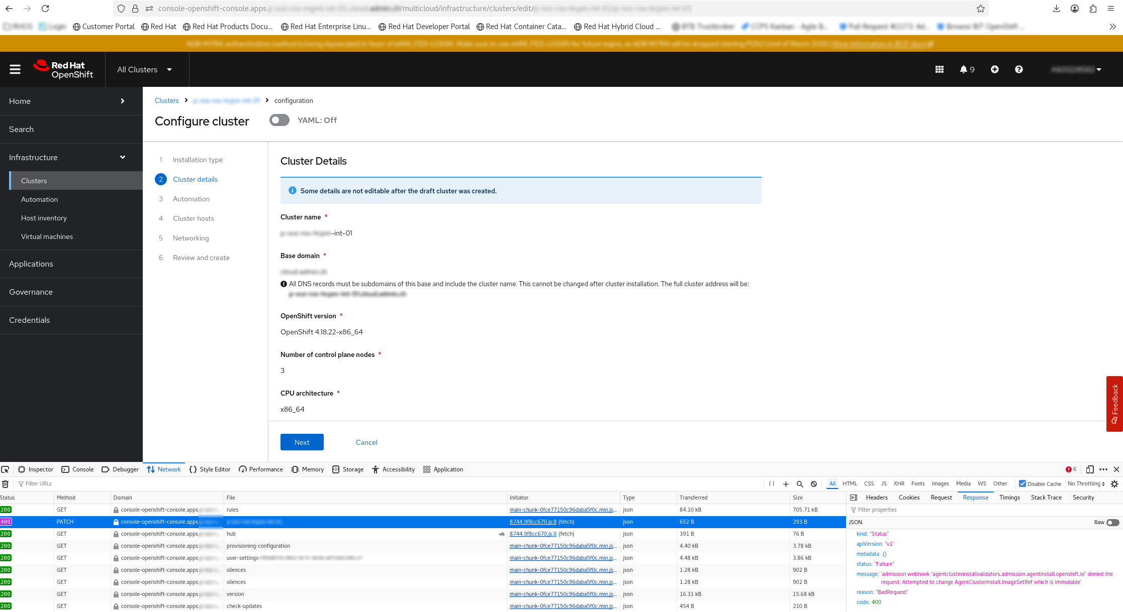 admission webhook "agentclusterinstallvalidators.admission.agentinstall.openshift.io" denied the request: Attempted to change AgentClusterInstall.ImageSetRef which is immutable