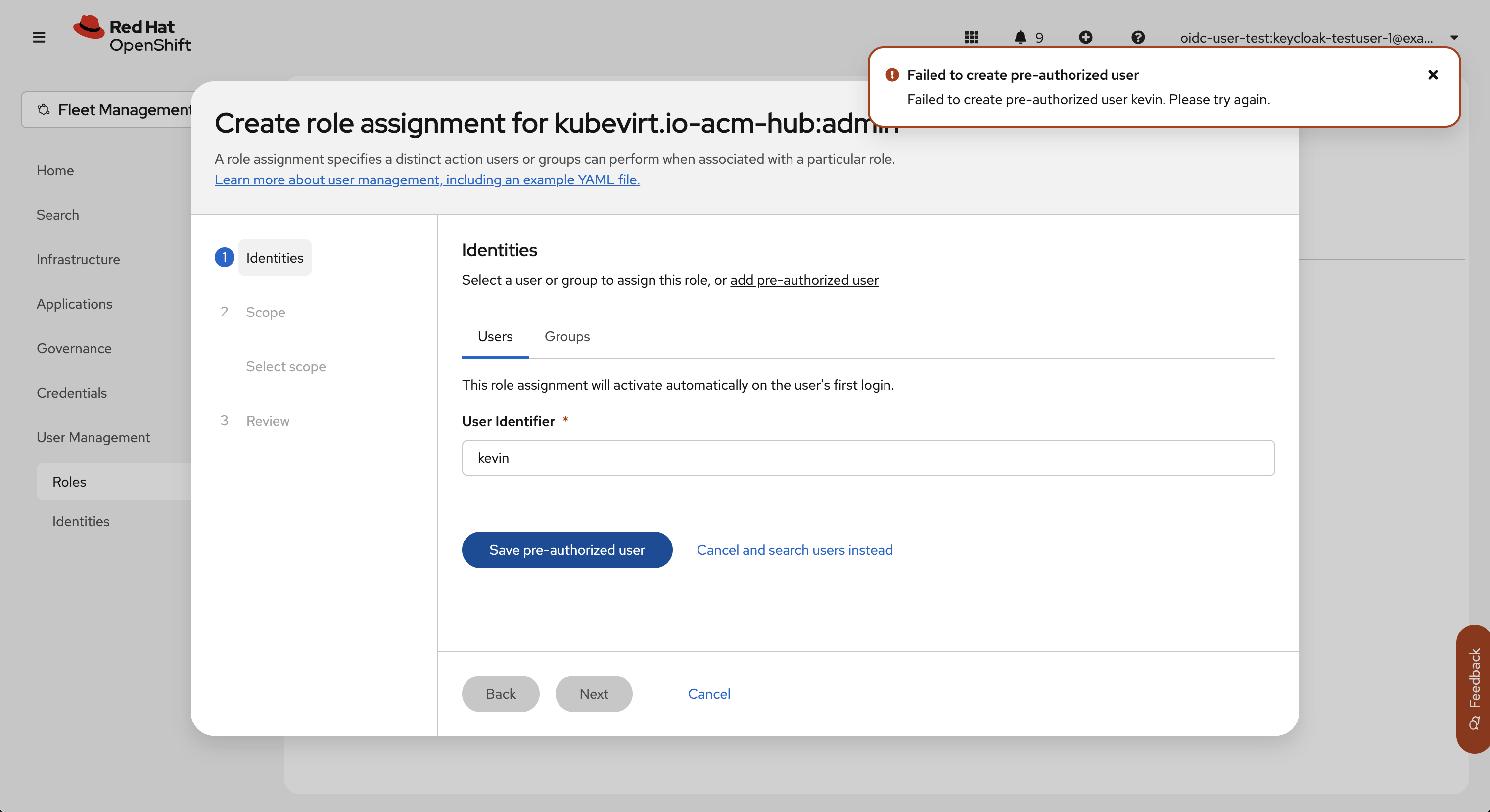 - From User management > Roles > <role> > Role assignments, Create role assignment should support manually entering a user or group