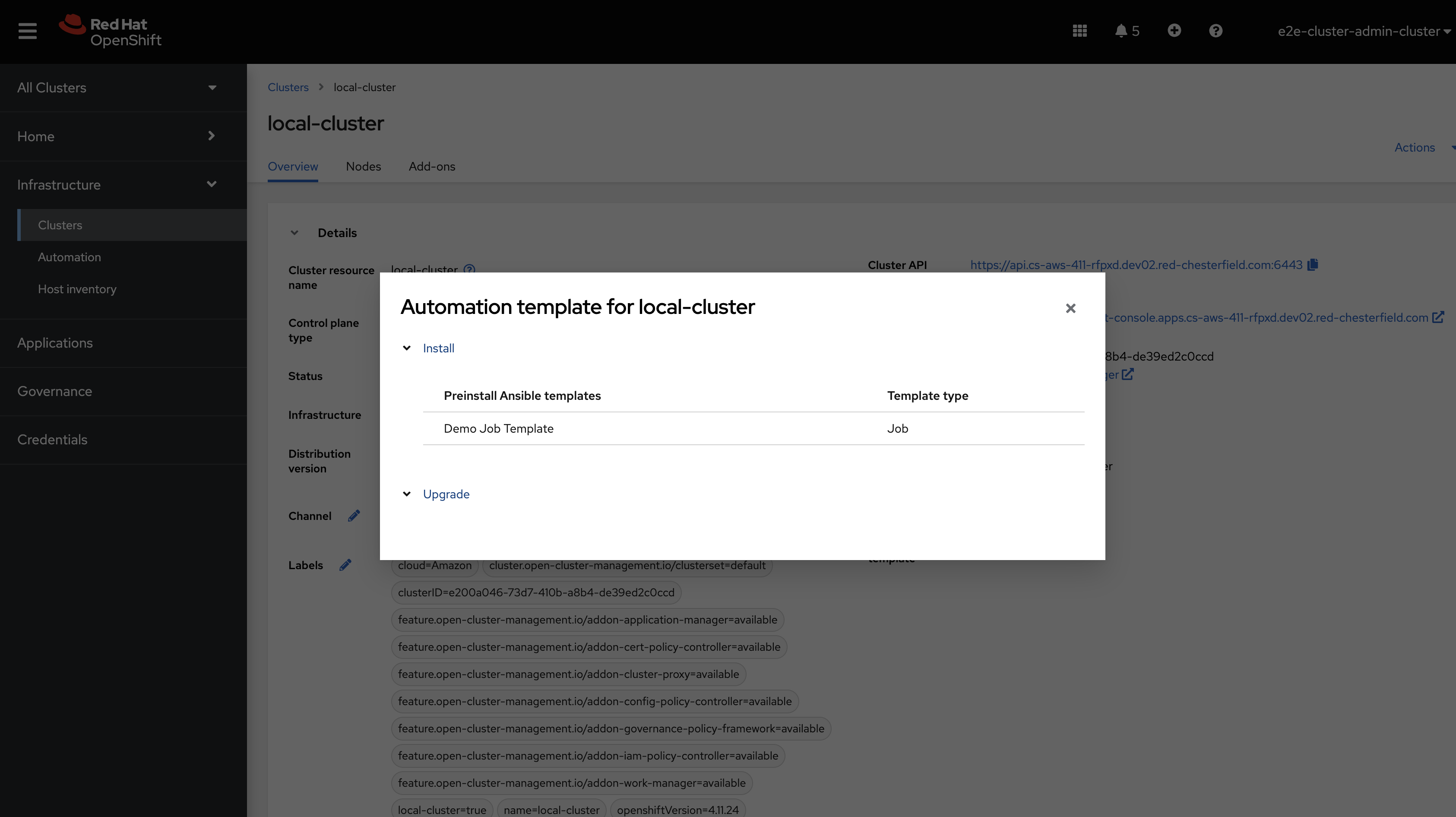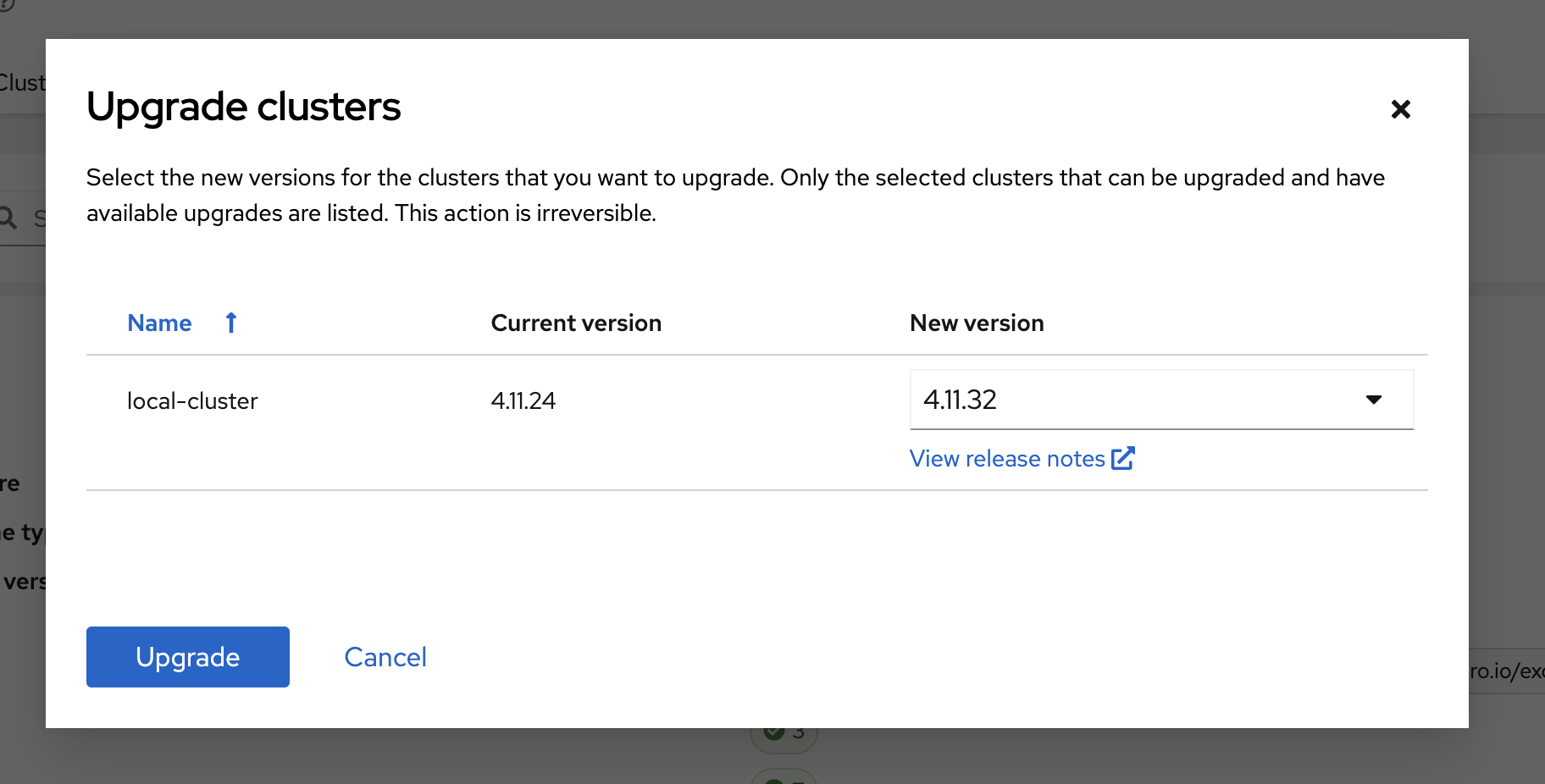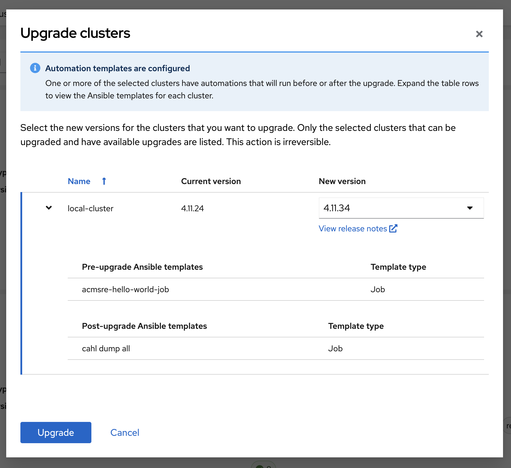 - Cluster upgrade modal informs the user if any of the clusters selected for upgrade have upgrade automations that will run