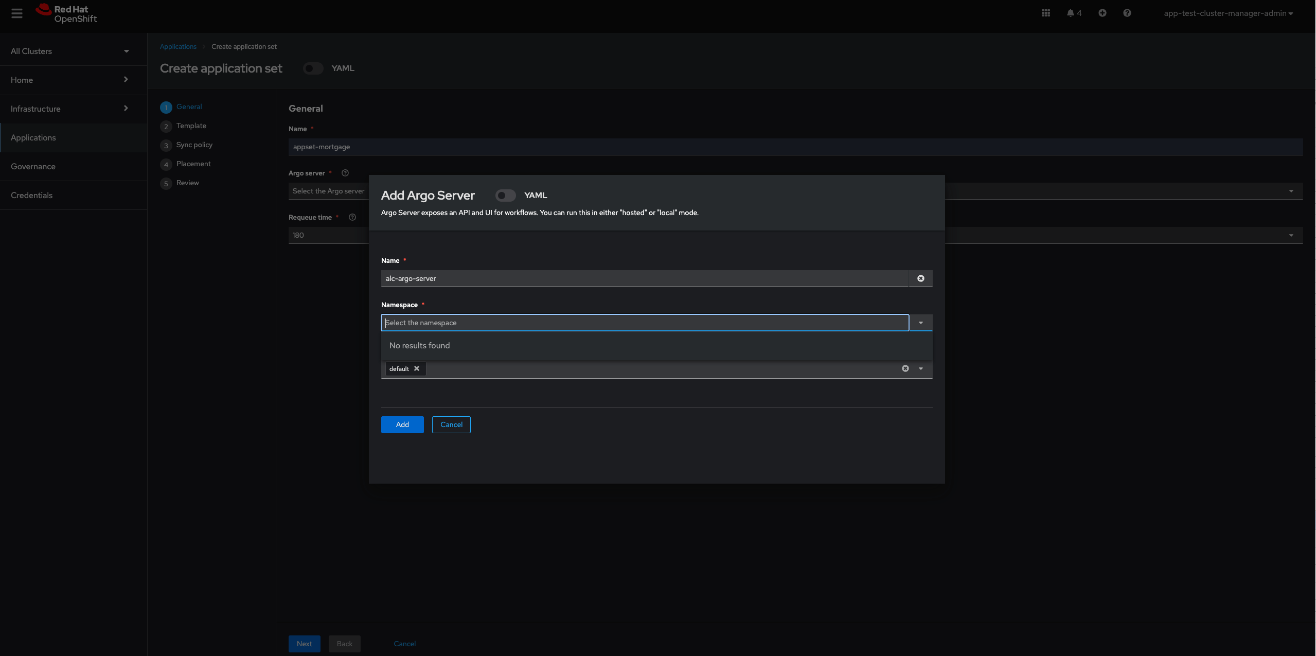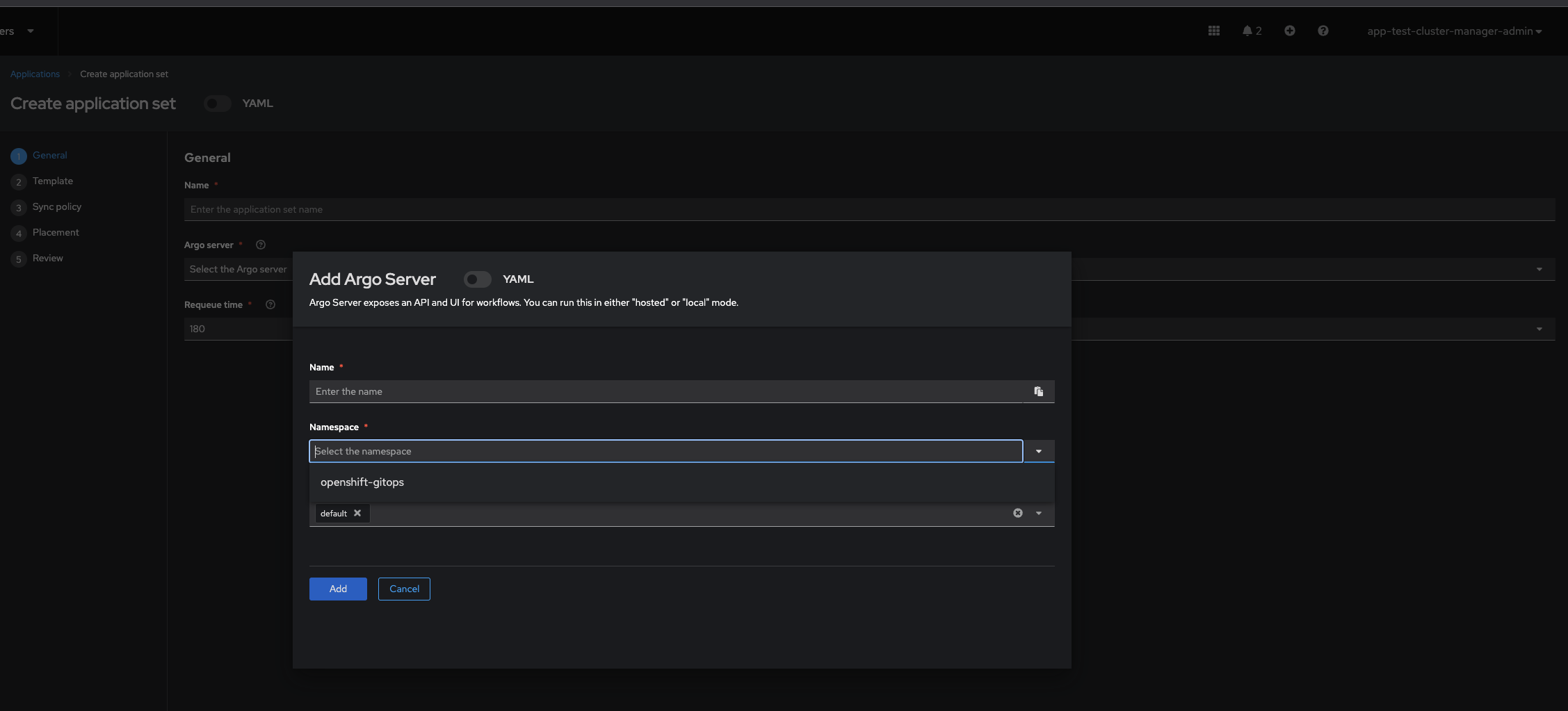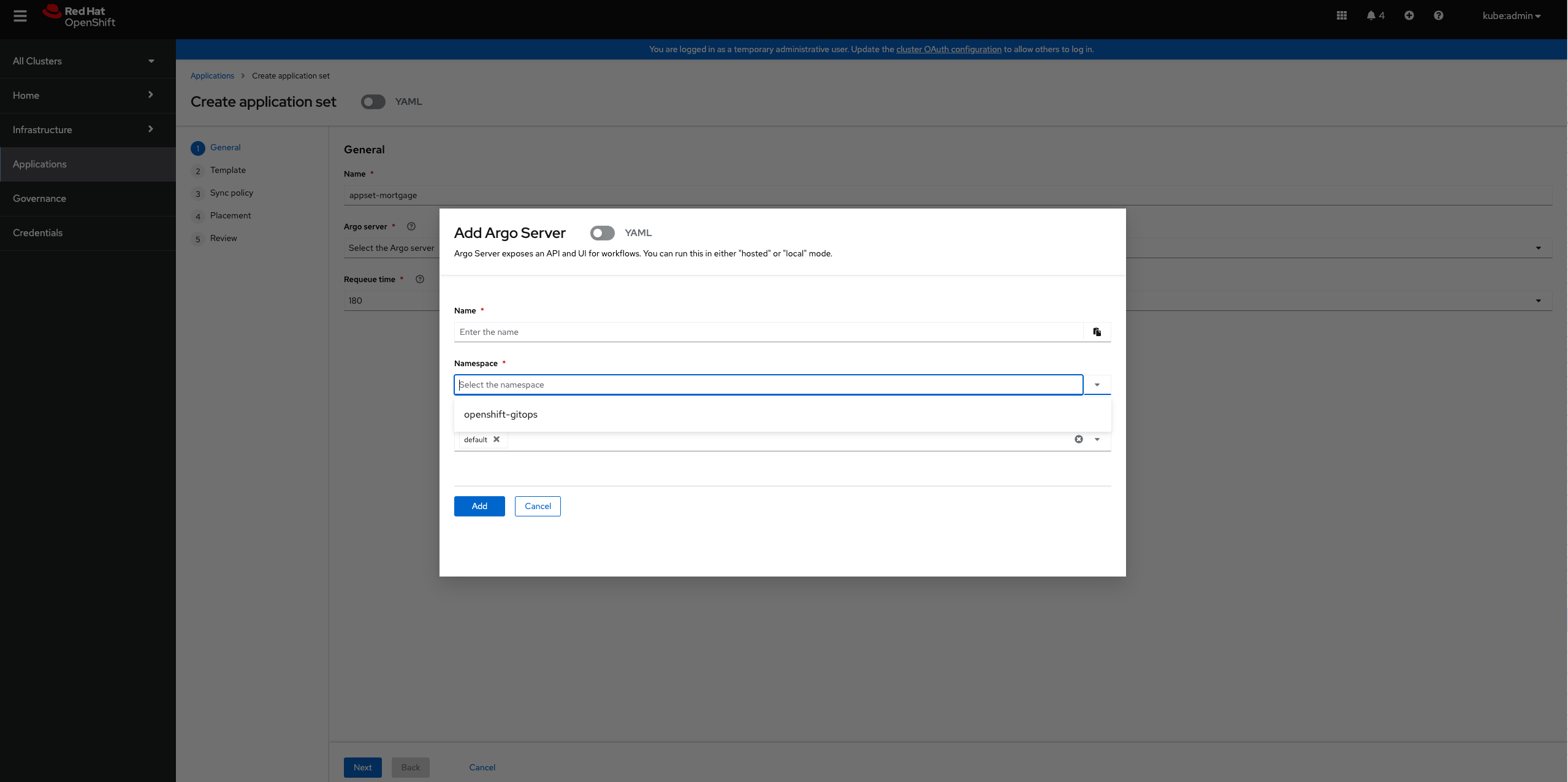 When creating a new argo server using the wizard, when logged in as a RBAC user, the gitops namespace does not show up, but is found when logged in as a kubeadmin