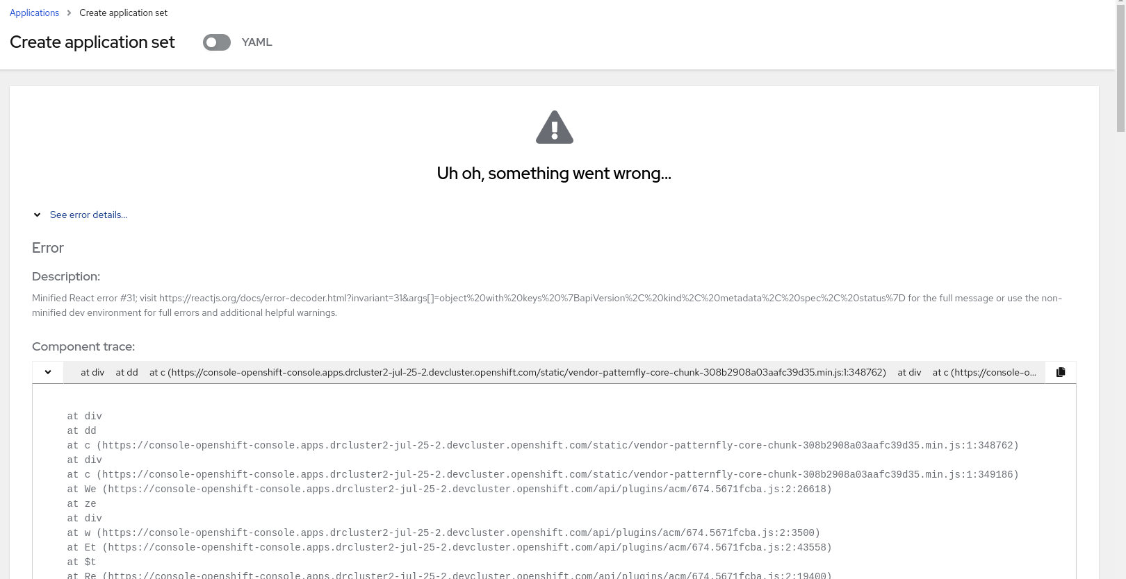 Unale to create application set application using ACM plugin