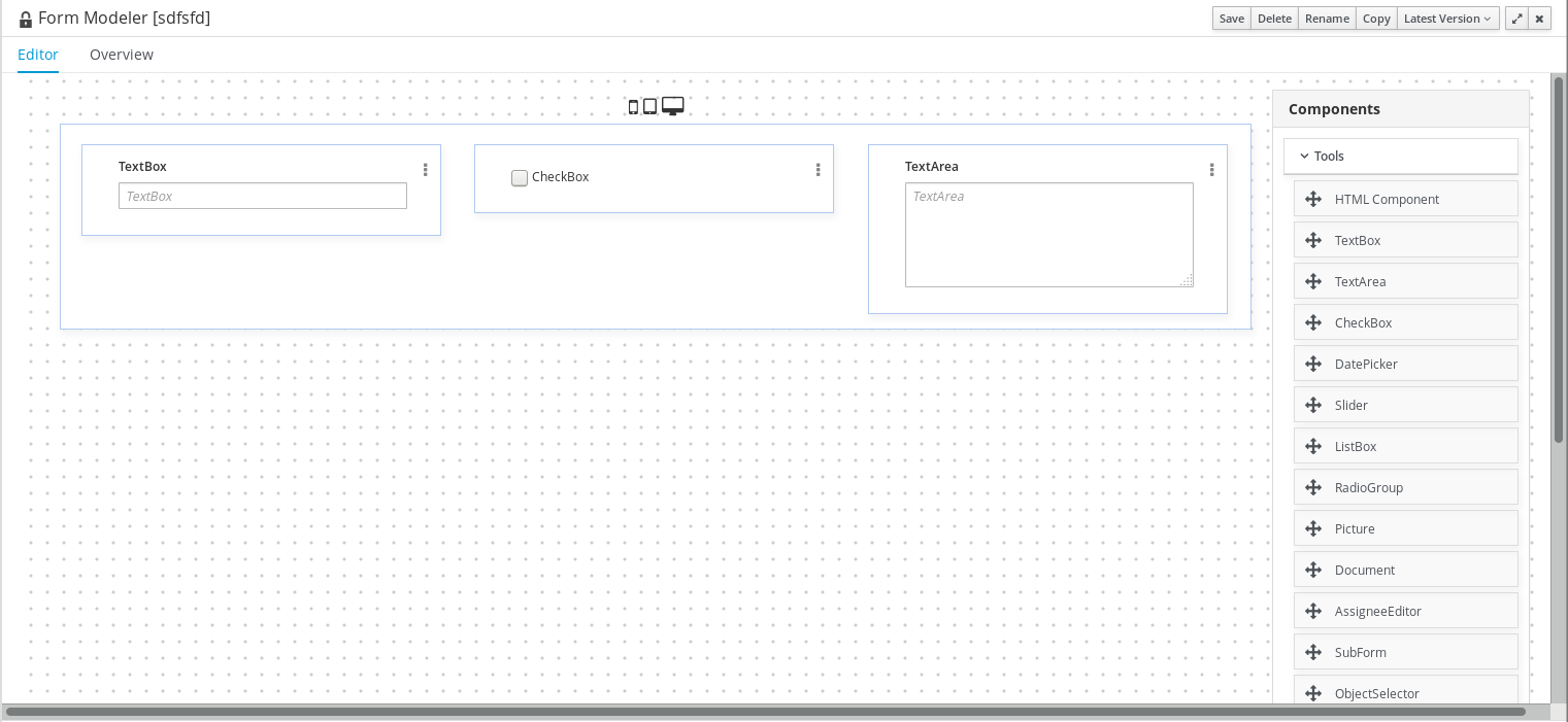 When putting different types of components (TextBox, CheckBox and TextArea) into one line, each of them has the lower end on different place, which doesn't looks nice (see the picture). It would be better if all of them were aligned with the biggest component (in this case TextArea).