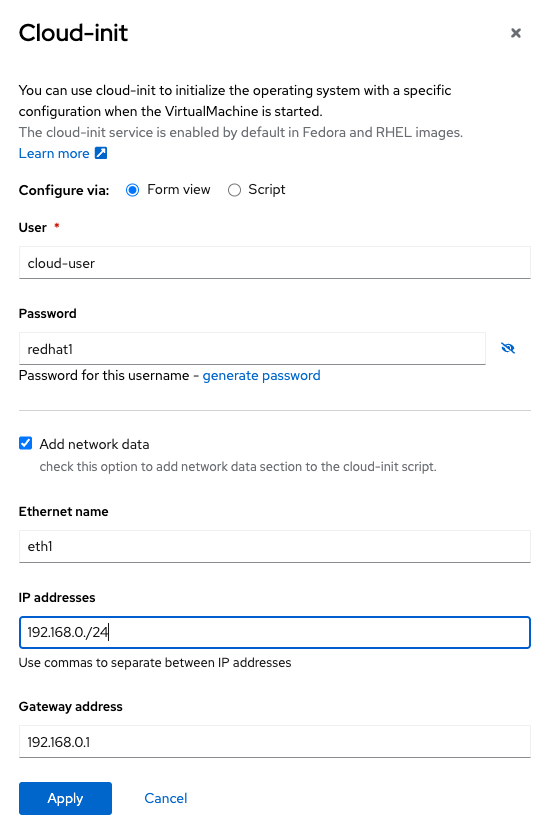 On the cloud-init screen, click the check box to add network data. Enter the Ethernet name, enter the IP addresses (192.168.0.10/24), move the cursor (using the arrow keys) to the left to correct any of the numbers in the IP address, and when you hit any key, it will move the cursor to the end of the line.
