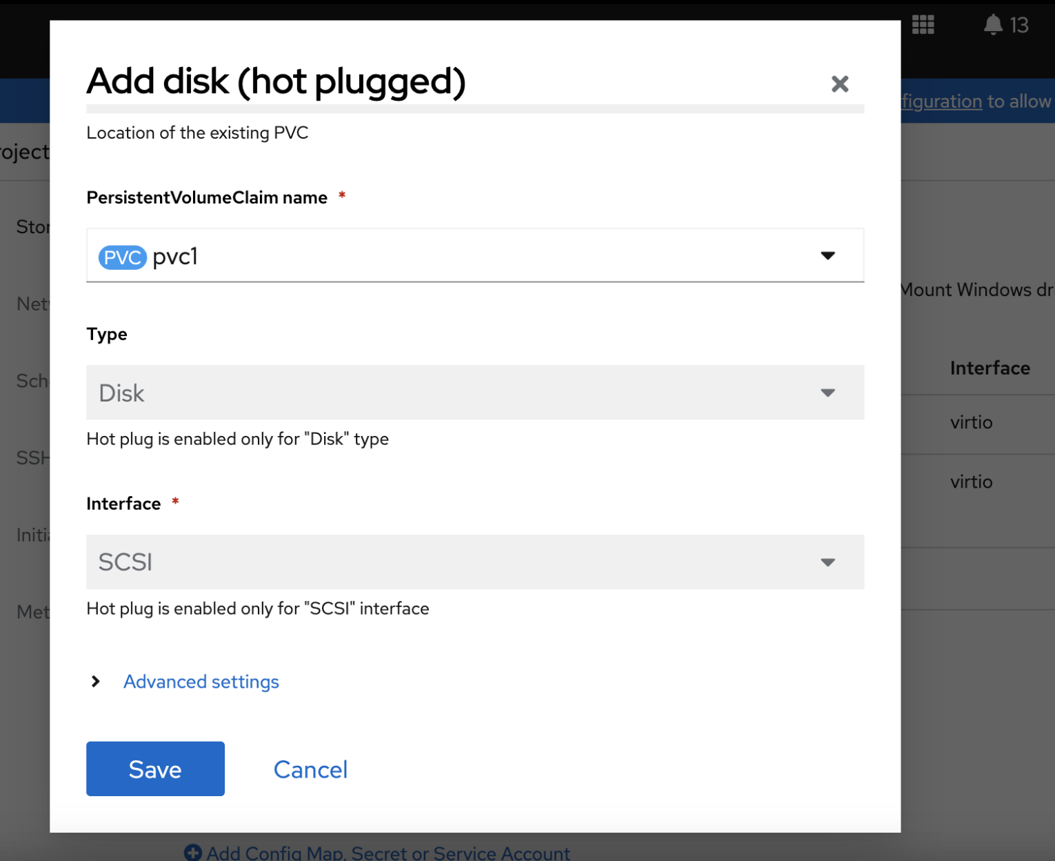 LUN type works with virtctl addvolume --disk-type lun $ virtctl addvolume fedora1 --volume-name=pvc1 --disk-type lun Successfully submitted add volume request to VM fedora1 for volume pvc1 ------------8<------------------- devices: disks: - disk: bus: virtio name: rootdisk - disk: bus: virtio name: cloudinitdisk - lun: bus: scsi name: pvc1 serial: pvc1 interfaces: ------------8<-------------------