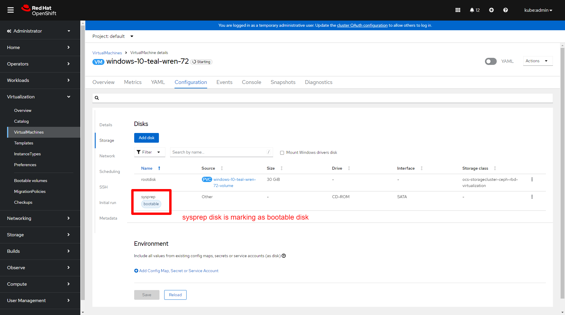 1. create vm from instancetype and add sysprep file 2. check disks in storage tab 3.