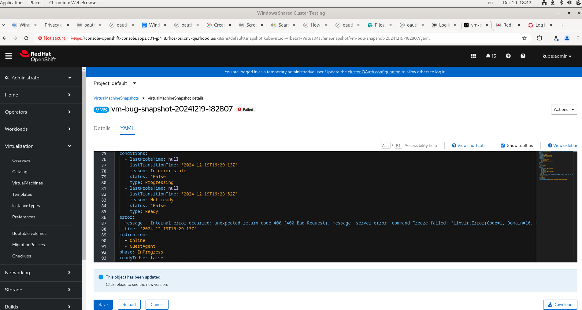 # oc get virtualmachinesnapshot snapshot-aquamarine-hare-33 -o yaml apiVersion: snapshot.kubevirt.io/v1alpha1 kind: VirtualMachineSnapshot metadata: creationTimestamp: "2024-09-18T05:50:13Z" finalizers: - snapshot.kubevirt.io/vmsnapshot-protection generation: 4 name: snapshot-aquamarine-hare-33 namespace: homelab ownerReferences: - apiVersion: kubevirt.io/v1 blockOwnerDeletion: false kind: VirtualMachine name: rhel-8 uid: 1bd72695-04e8-450e-9998-46b62dd92895 resourceVersion: "1011220" uid: c349c24a-7d0a-4db2-b57d-84c947388328 spec: source: apiGroup: kubevirt.io kind: VirtualMachine name: rhel-8 status: conditions: - lastProbeTime: null lastTransitionTime: "2024-09-18T05:55:13Z" reason: snapshot deadline exceeded status: "False" type: Progressing - lastProbeTime: null lastTransitionTime: "2024-09-18T05:50:14Z" reason: Not ready status: "False" type: Ready - lastProbeTime: null lastTransitionTime: "2024-09-18T05:55:13Z" reason: snapshot deadline exceeded status: "True" type: Failure indications: - Online - GuestAgent phase: Failed readyToUse: false sourceUID: 1bd72695-04e8-450e-9998-46b62dd92895
