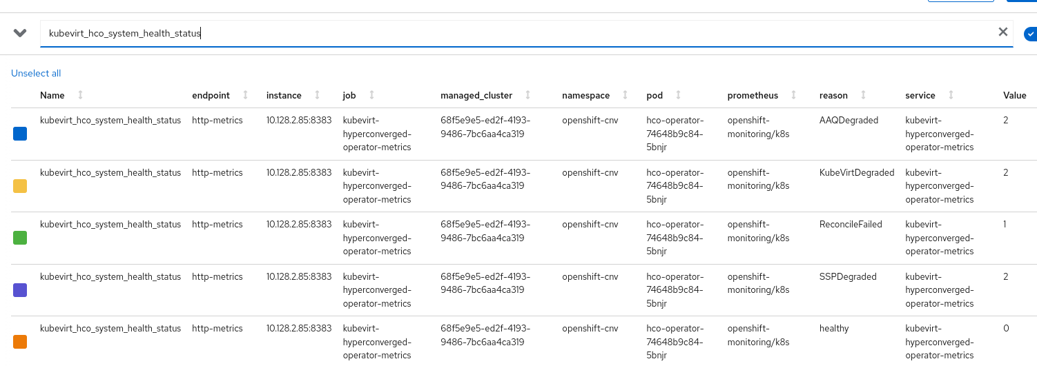 The alert OperatorConditionsUnhealthy should fire only once per cluster and the "kubevirt_hco_system_health_status" metric should only have 1 aggregated value. I dont see an issue in the conditions in the HCO CR page, but the conditions status in the Overview dashboard is in error and there are 3 OperatorConditionsUnhealthy alerts firing. I also see that the alert is firing both in critical and warning severities, which doesnt make sense. We should focus on the higher severity. If we should drop the "reason" label for that, than we should. If there is a way to aggregated the data in the reason label to a single value Like for example in the case in the screenshot : reason: "AAQDegraded, SSPDegraded, KubeVirtDegraded". See screenshots.
