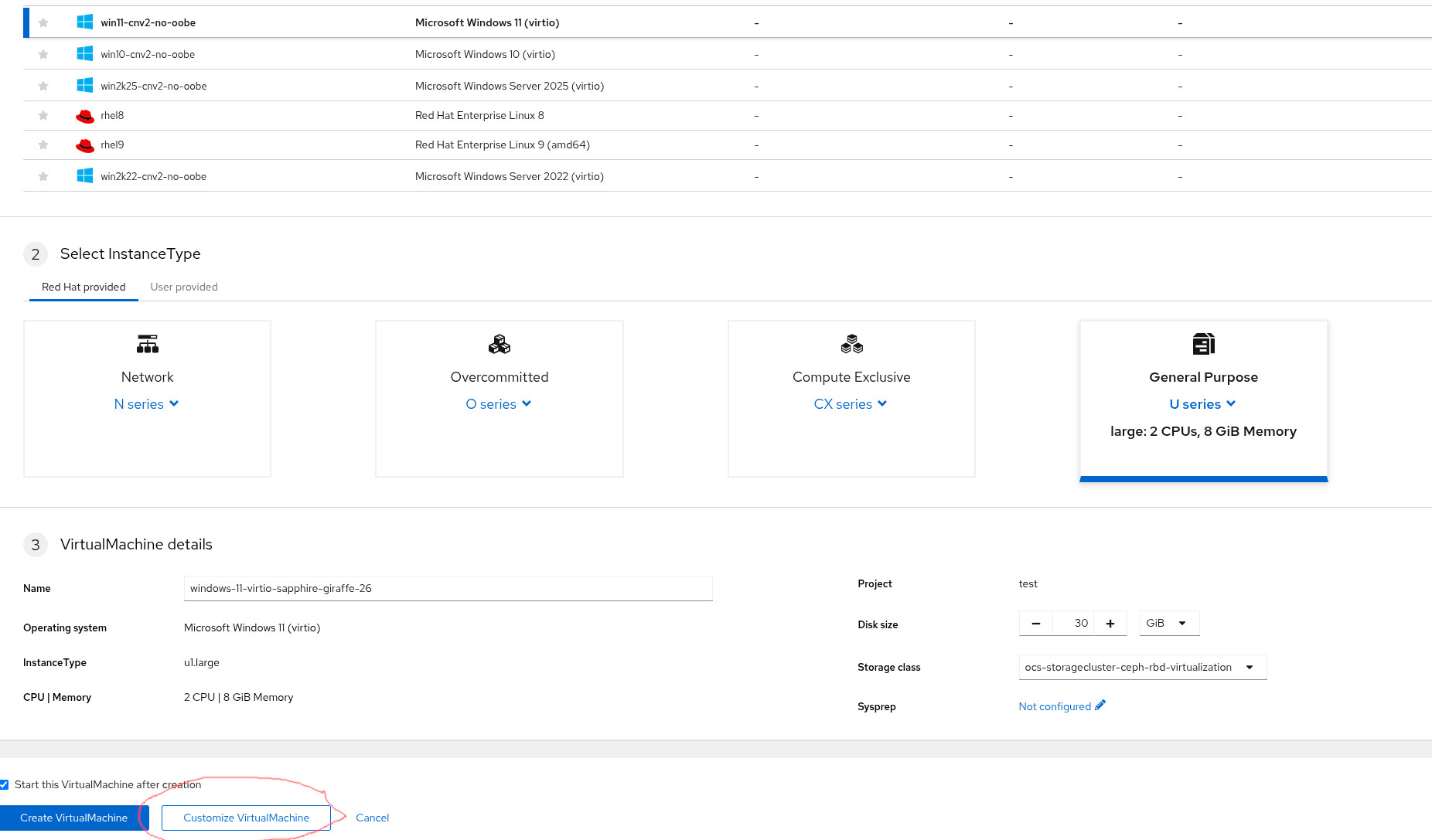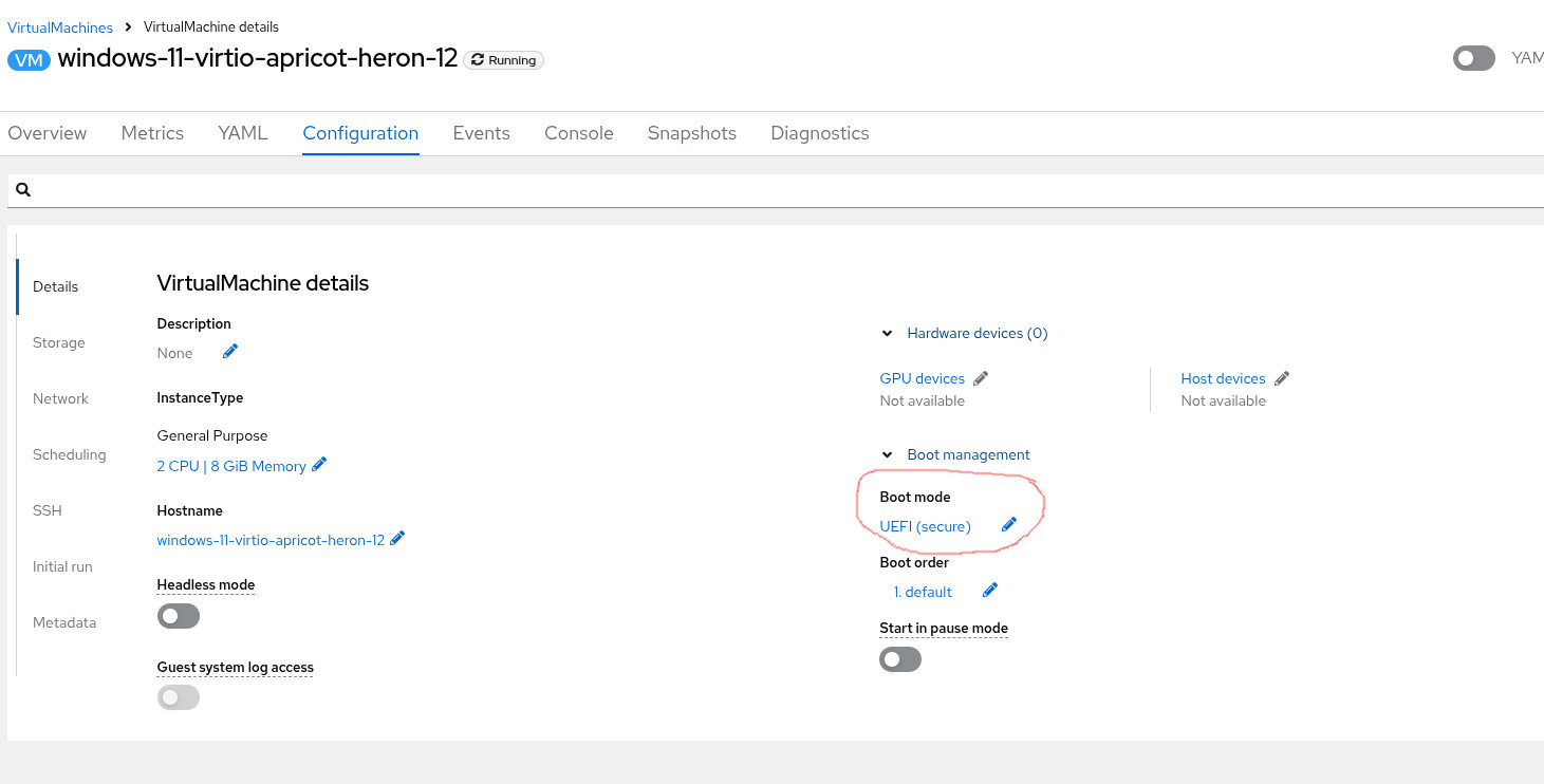 1. Select Windows 11 bootable volume, instance type and preference are automatically preselected 2. Click on Customize Virtual Machine 3. Be sure boot mode is preselected with BIOS 4. Click on Create Virtual machine 5. VM is running, check the configuration page and see UEFI (secure) boot mode