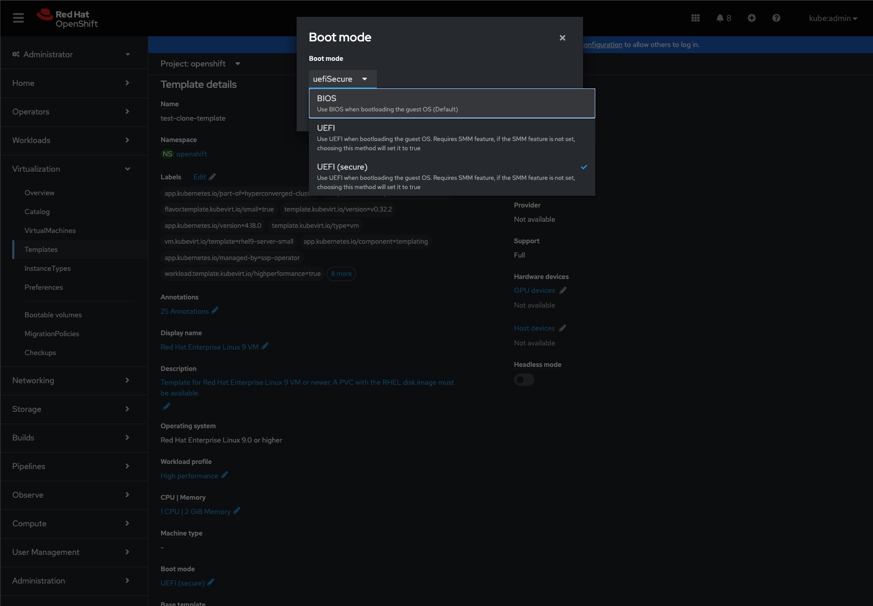 1. clone a template 2. in template Details tab click Boot mode edit button 3.