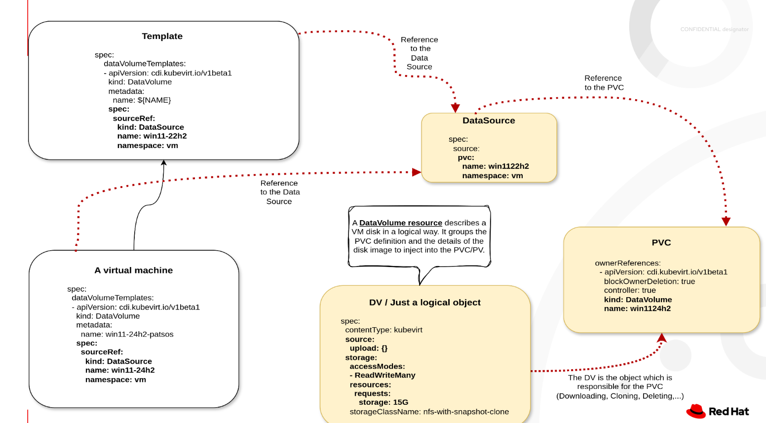 The person is able to explain that templates point to DataSources, e.g. the RHEL 9 templates point to the DataSoruce with the name rhel9 in the namespace openshift-virtualisation-os-images . A DataSource points to a DataVolume/PVC, e.g. rhel9-0c9204ba64c2, a DataVolume is an object that manages the creation, e.g. download or clone, of a PVC. The DV then points to a PVC. With ‘managed’ stuff there is a DataImportCron that regularly checks if there is a new version of the source, e.g. a new RHEL image in the red hat registry, and if so, the DIC creates a new DV, this downloads the new PVC, if the download has worked, it switches the DS from the old to the new DS/PVC and deletes old versions of the DS/PVC. In the new volume/instancetype/preference-based flow, the DIC also downloads the DS/PVC, but the names and namespaces can then be freely selected. A diagram might be helpful to visualize the relationships between the entities.