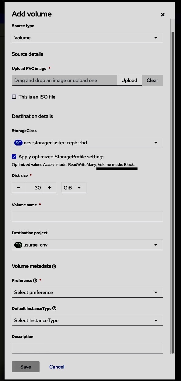 Option to select from volume modes and access mode.