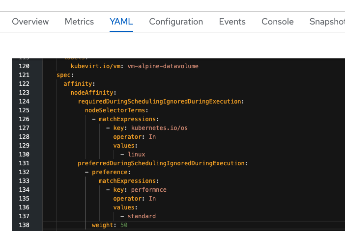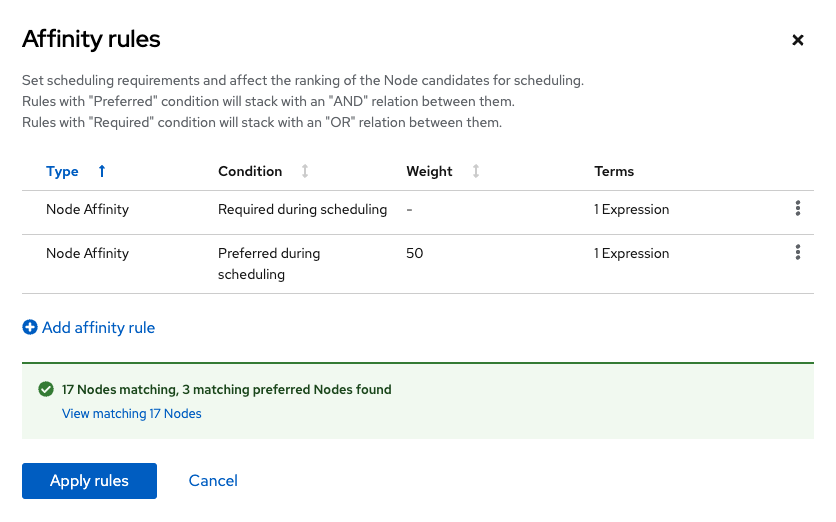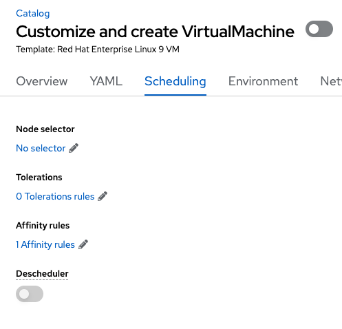 1. New VM from Template - using a default rhel 9 is fine 2. Click the Scheduling tab 3. Click Affinity rules 4. Add affinity rule Type: Node Affinity Condition: Required during scheduling 5. Add expression kubernetes.io/os In linux 6. Save affinity rule 7. Add affinity rule Type: Node Affinity Condition: Perferred during scheduling Weight: 50 (doesn't really matter for this) 8. Add expression - Nodes have a label performance with a value of standard and high performance In standard 9. Save affinity rule Now it shows both rules and 17 Nodes matching, 3 matching preferred Nodes found Click Apply Rules Now under: Affinity rules It only shows: 1 affinity rules