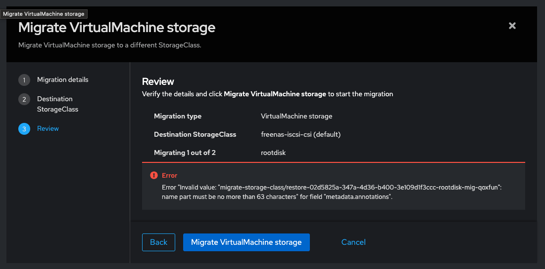 Error "Invalid value: "migrate-storage-class/restore-02d5825a-347a-4d36-b400-3e109d1f3ccc-rootdisk-mig-qoxfun": name part must be no more than 63 characters" for field "metadata.annotations".