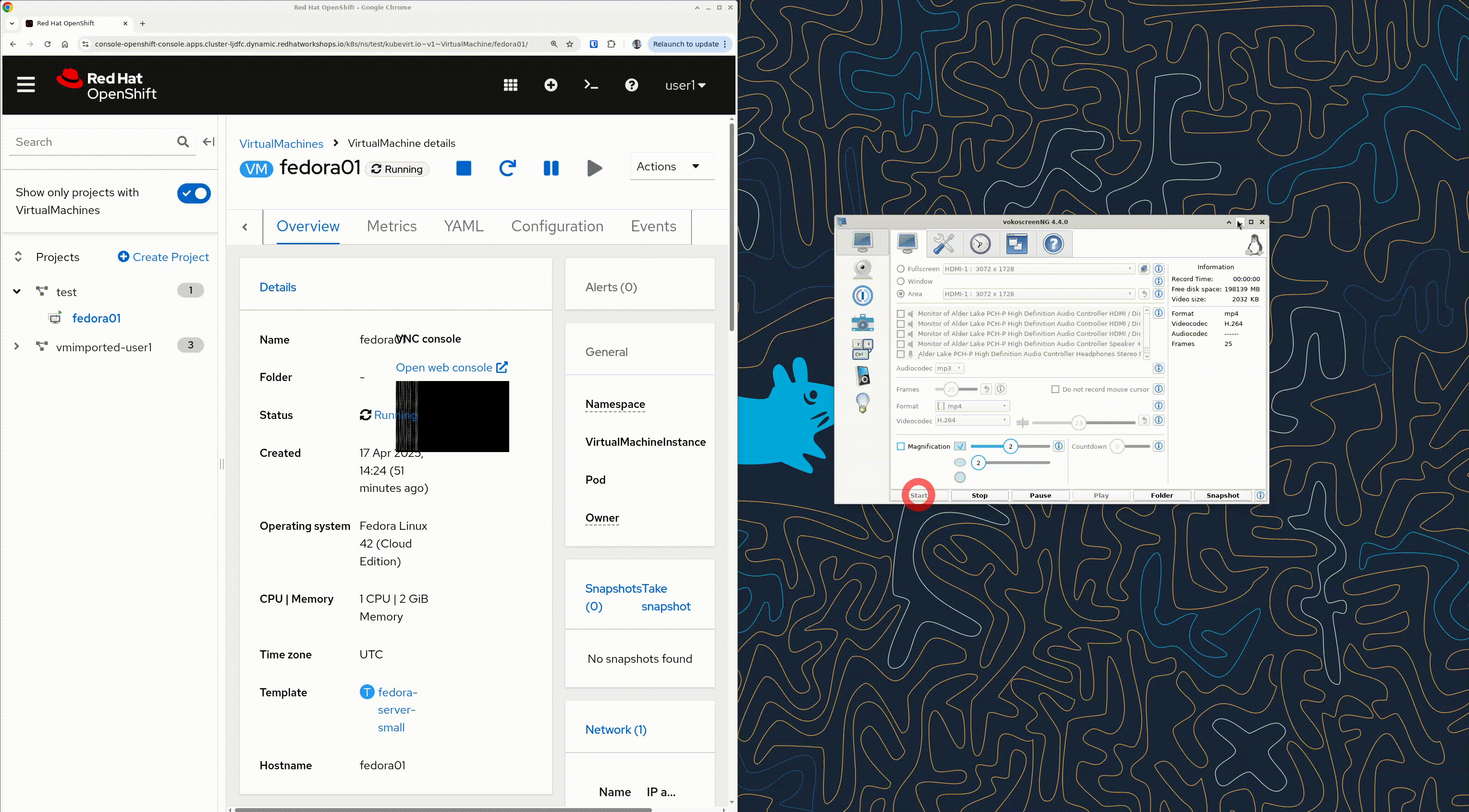 1.From a running fedora VM overview, click on "open web console" (above the thumbnail view 2.This open a new tab. Keep both tab side by side 3. Watch the vnc thumbnail, and the full screen vnc view compete for the connection (wait a few minute)
