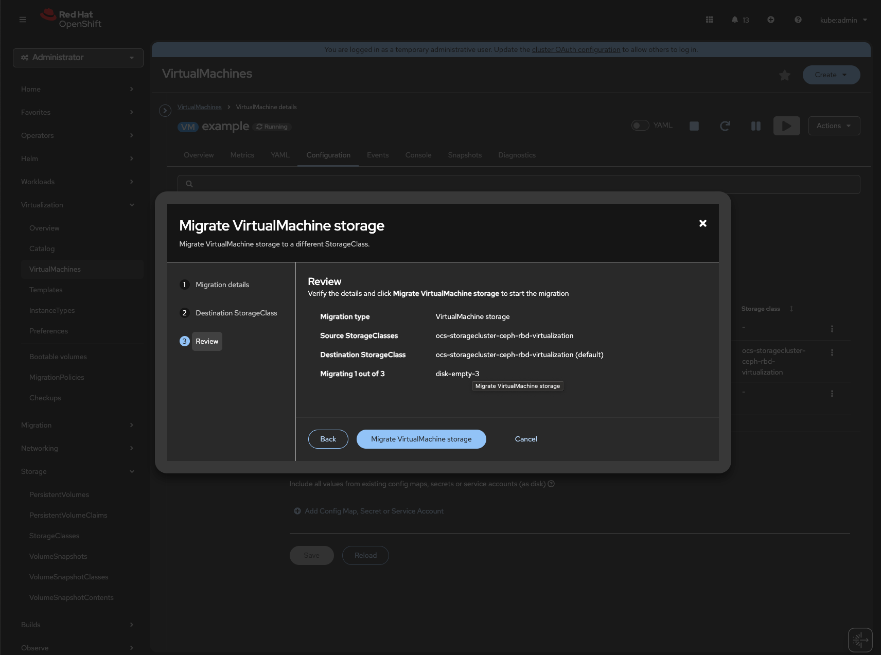 1. Migration is allowed to the same SC 2. Default SC is greyed out in target SC list 3. Migration fails