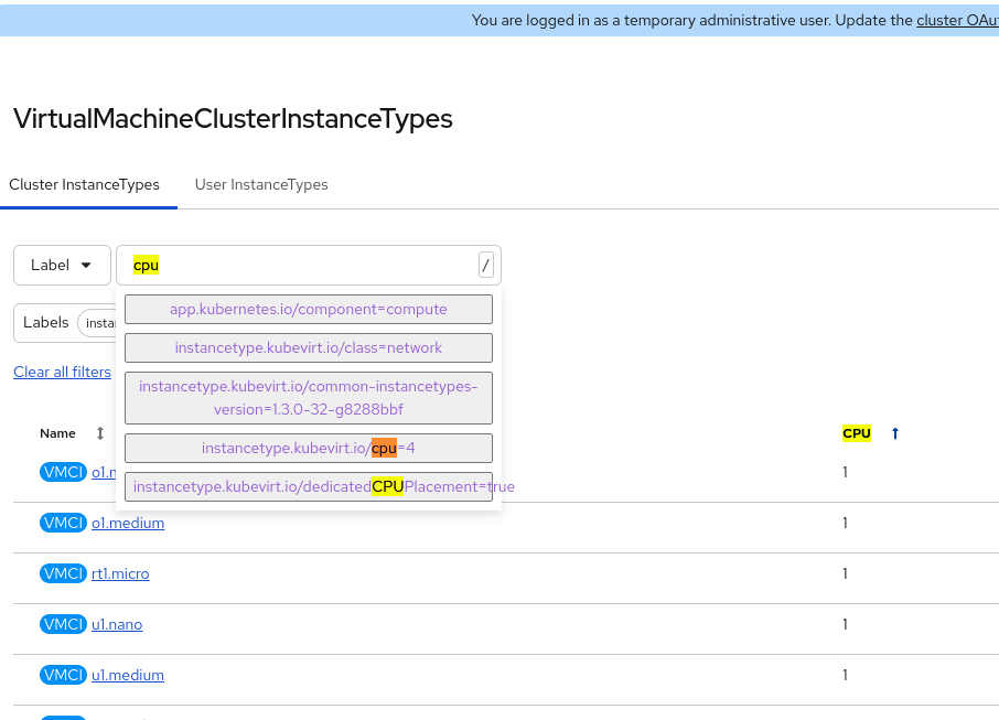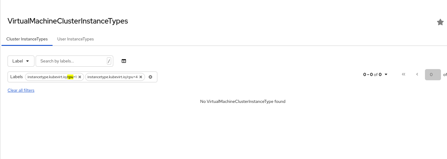 multiLabel search under VirtualMachineClusterInstanceTypes and VirtualMachineClusterPreferences does work when selected individual labels it works but not multi labels. screenshot attached