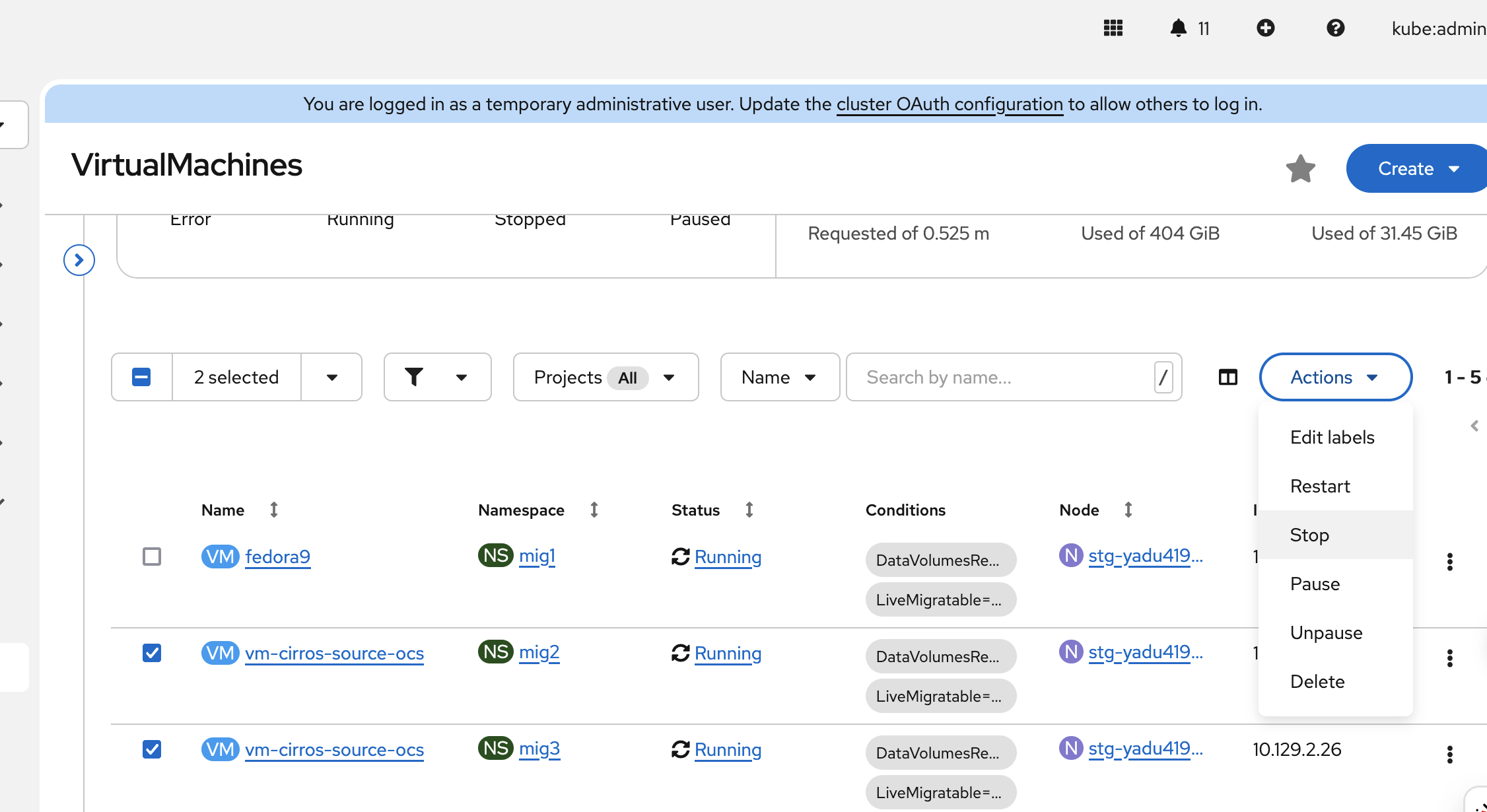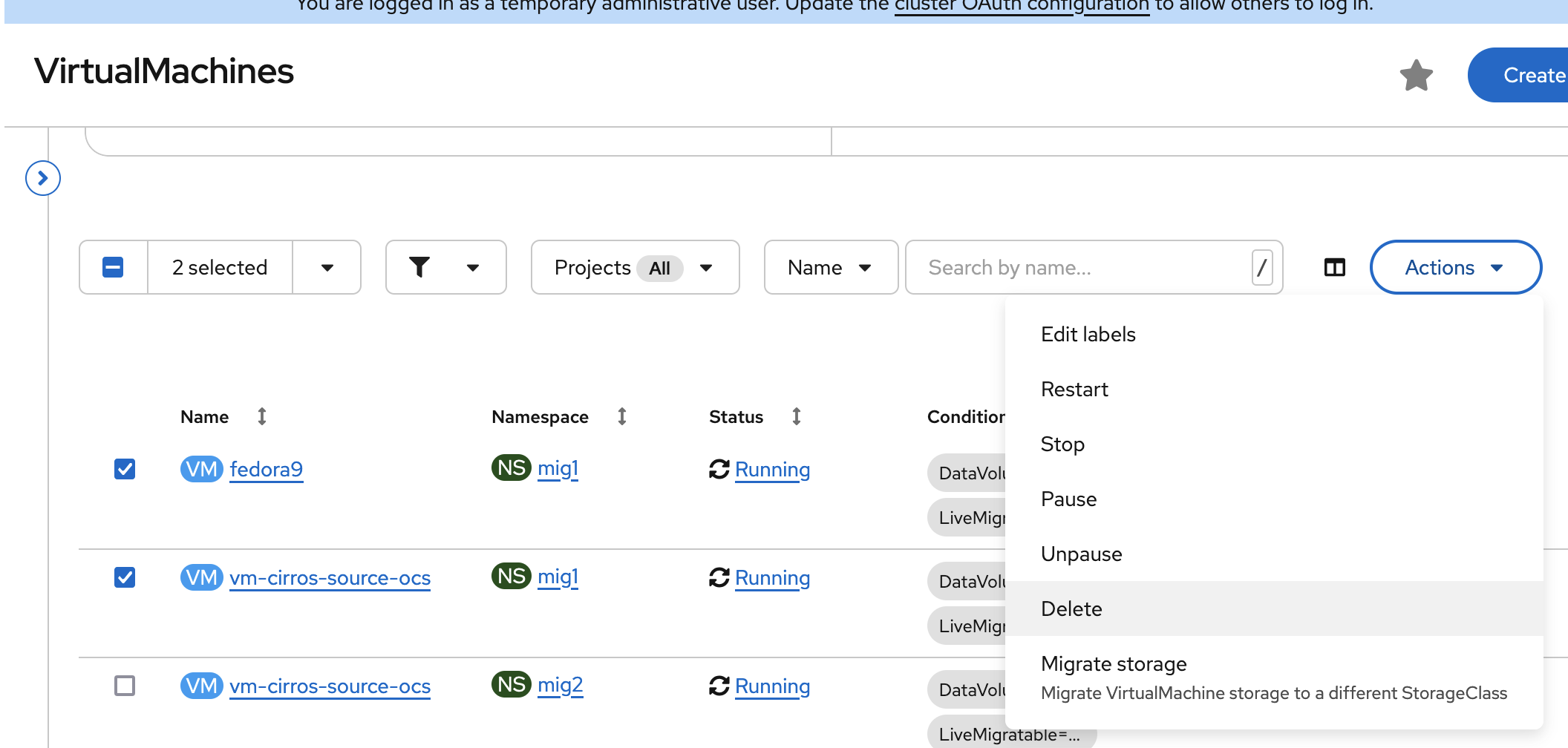 1. Create two namespace, mig1 and mig2 2. Create vm1 in mig1 and vm2 in mig2 3. Web console: navigate to Virtualization → VirtualMachines 4. Select multiple VMs cross namespace 5. Click Action