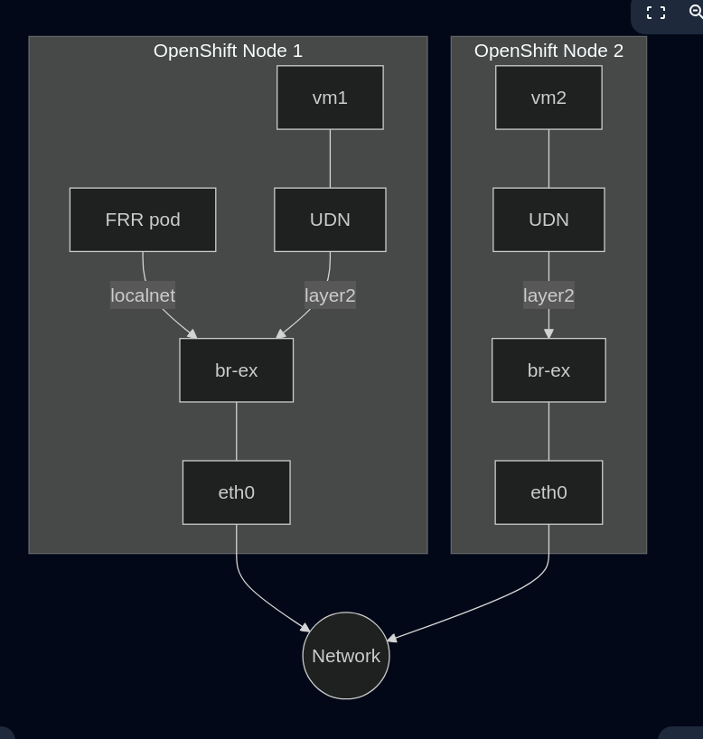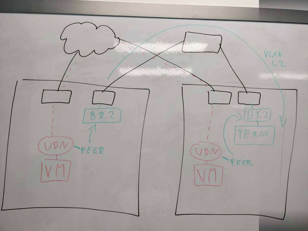 The PE router would be a pod or a VM. It will be connected to the physical network using localnet. UDNs would be configured to peer with it over the physical network.