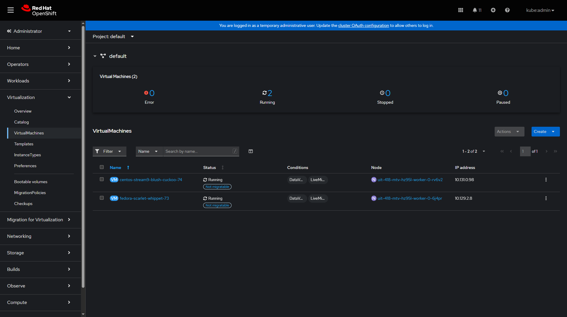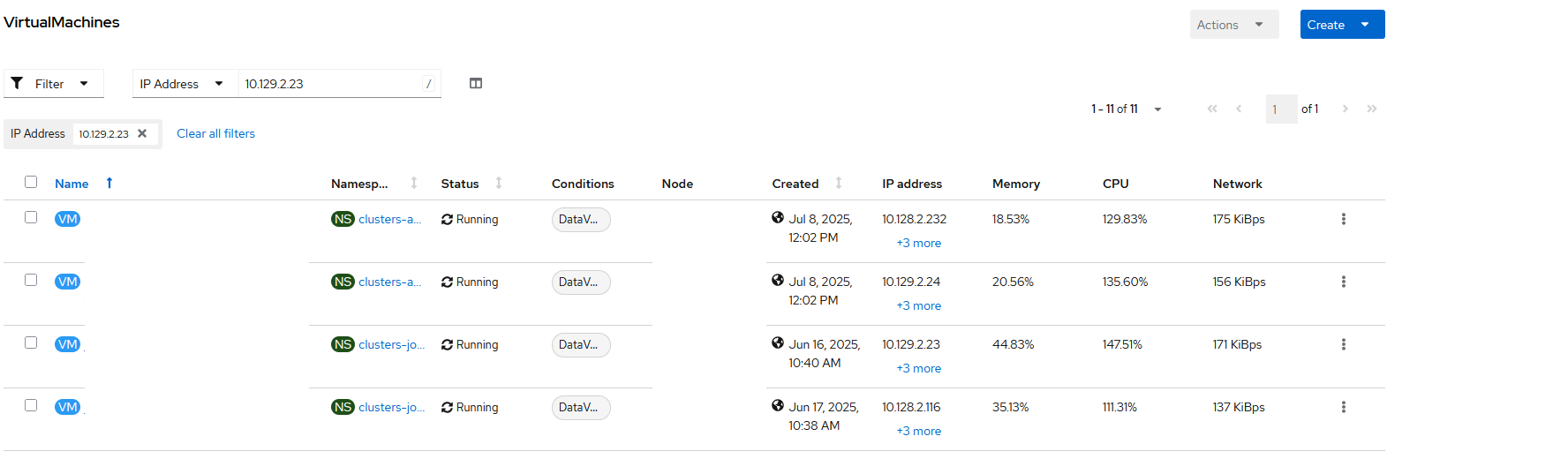 1. A list of all virtual machines is displayed, with VMs' names, namespaces,status, and their assigned IP addresses.