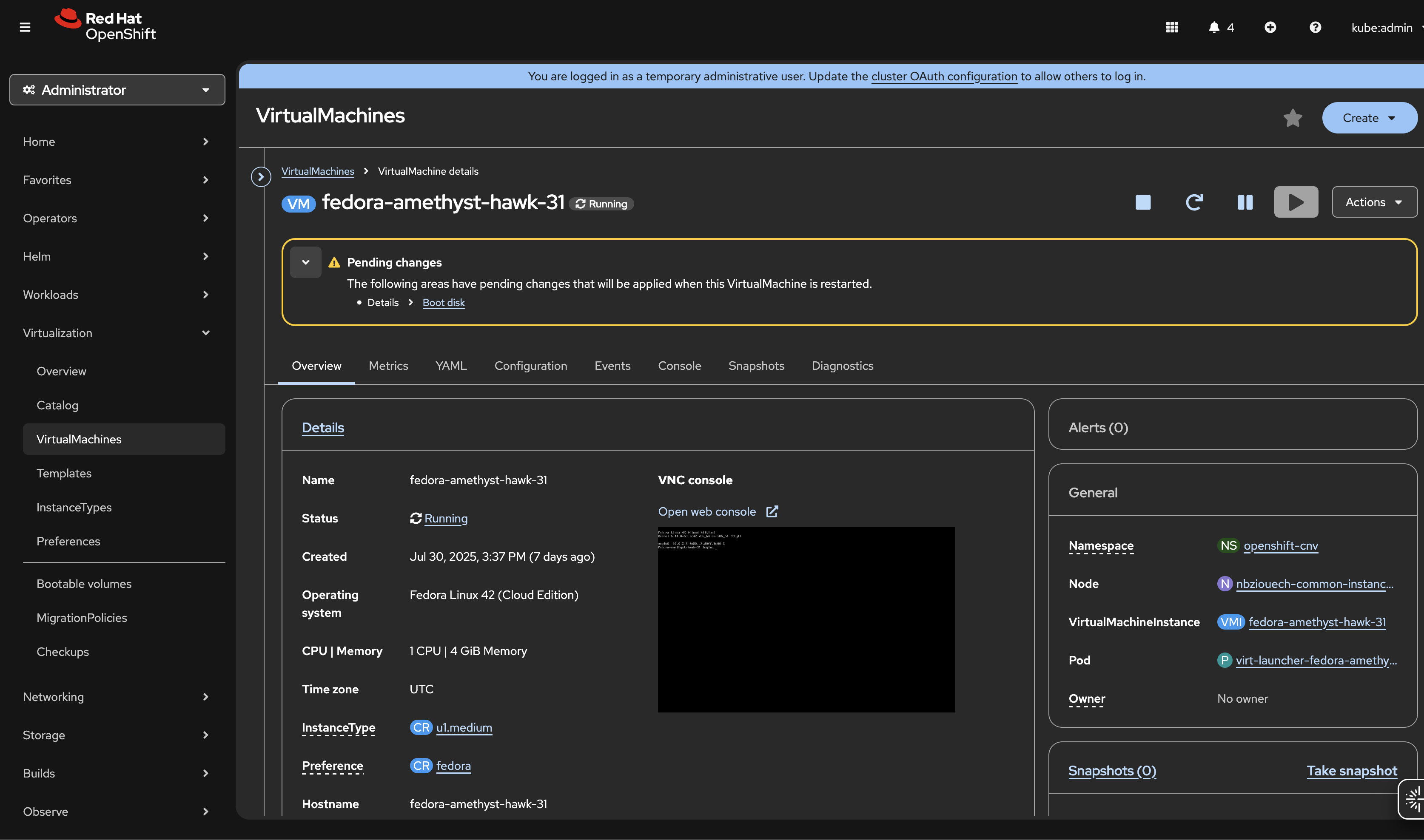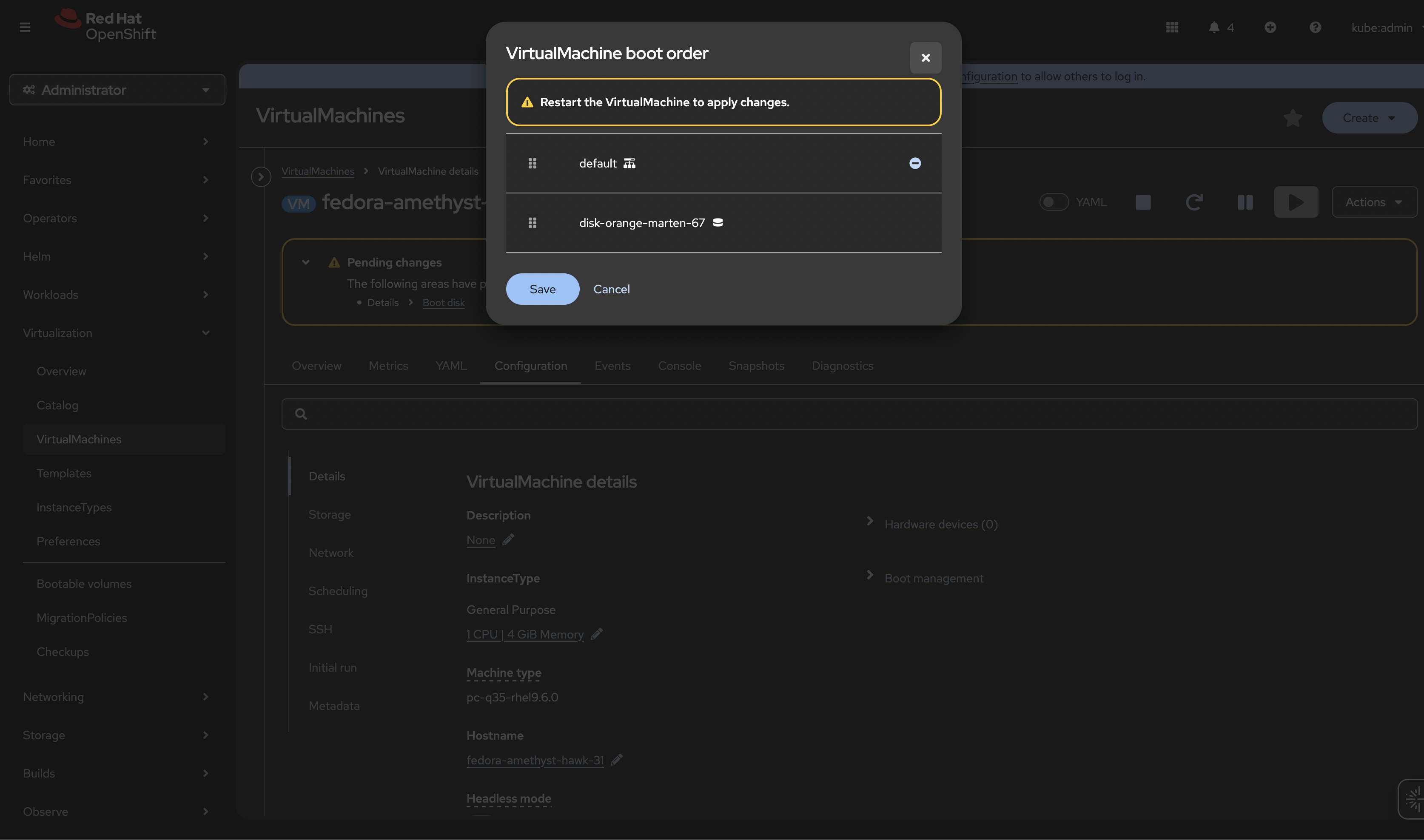 When we create a vm using common instance types in x86 Openshift cluster with 2disks(1 root disk+ 1 empty disk) is giving warning pending changes. The same warning is coming even after restarting the virtualmachine.