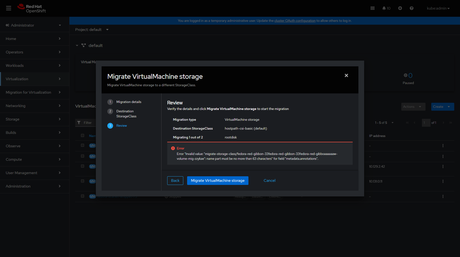 Create a VM with a bit long name, around 63 characters. Try to do storatge migration, it fails with error: Error "Invalid value: "migrate-storage-class/fedora-red-gibbon-33fedora-red-gibbon-33fedora-red-gibboaaaaaaw-volume-mig-w553uy": name part must be no more than 63 characters" for field "metadata.annotations". The issue only happens in 4.18.z, not happen in 4.19 and 4.20.